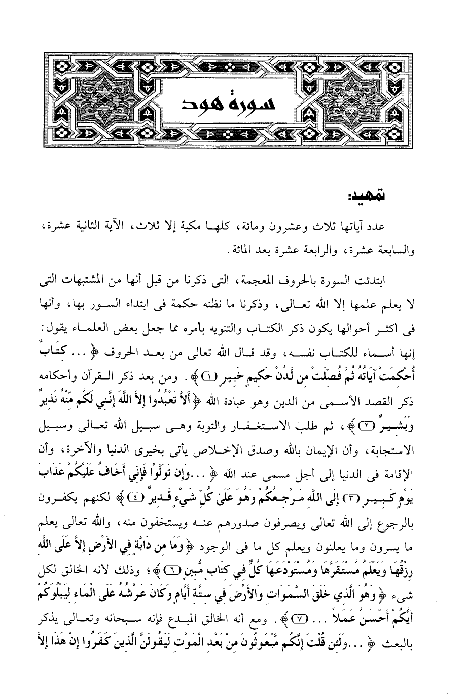 إنها أسماء للكتاب ننسحه، وقد قال اللَّه تعالى من بعد الحروف (. . . كِتَابٌ أُحْكِمَتْ آيَاتُهُ ثُمَّ فُصِّلَتْ مِنْ لَدُنْ حَكِيمٍ خَبِيرٍ). ومن بعد ذكر القرآن وأحكامه ذكر القصد الأسمى من الدين وهو عبادة اللَّه (أَلَّا تَعْبُدُوا إِلَّا اللَّهَ إِنَّنِي لَكُمْ مِنْهُ نَذِيرٌ وَبَشِيرٌ)، ثم طلب الاستغفار والتوبة وهي سبيل اللَّه تعالى وسبيل الاستجابة، وأن الإيمان باللَّه وصدق الإخلاص يأتي بخيري الدنيا والآخرة، وأن الإقامة في الدنيا إلى أجلٍ مسمى عند اللَّه (. . . وَإِن تَوَلَّوْا فَإِنِّي أَخَافُ عَلَيْكُمْ عَذَابَ يَوْمٍ كَبِيرٍ إِلَى اللَّهِ مرْجِعُكُمْ وَهُوَ عَلَى كُلِّ شَيْءٍ قَدِيرٌ) لكنهم يكفرون بالرجوع إلى اللَّه تعالى ويصرفون صدورهم عنه ويستخفون منه، واللَّه تعالى يعلم ما يسرون وما يعلنون ويعلم كل ما في الوجود (وَمَا مِنْ دَابَّةٍ فِي الْأَرْضِ إِلَّا عَلَى اللَّهِ رِزْقُهَا وَيَعْلَمُ مُسْتَقَرَّهَا وَمُسْتَوْدَعَهَا كُلٌّ فِي كِتَابٍ مُبِينٍ (6)؛ وذلك لأنه الخالق لكل شيء (وَهُوَ الَّذِي خَلَقَ السَّمَاوَاتِ وَالْأَرْضَ فِي سِتَّةِ أَيَّامٍ وَكَانَ عَرْشُهُ عَلَى الْمَاءِ لِيَبْلُوَكُمْ أَيُّكُمْ أَحْسَنُ عَمَلًا. . .). ومع أشه الخالق المبدع فإنه سبحانه وتعالى يذكر بالبعث (. . . وَلَئِن قُلْتَ إِنَّكُم مَّبْعُوثُونَ مِنْ بَعْدِ الْمَوْتِ لَيَقُولَنَّ الَّذِينَ كفَرُوا إِنْ هَذَا إِلَّا