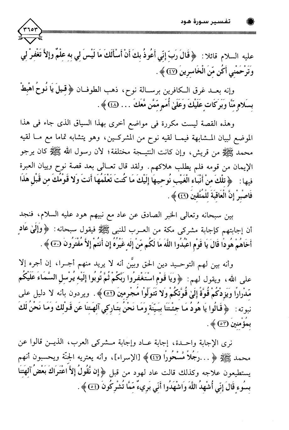 وهذه القصة ليست مكررة في مواضع أخرى بهذا السياف الذي جاء في هذا الموضع لبيان المشابهة فيما لقيه نوح من المشركين، وهو يتشابه تماما مع ما لقيه محمد - صلى الله عليه وسلم - من قريش، وإن كانت النتيجة مختلفة، لأن رسول اللَّه - صلى الله عليه وسلم - كان يرجو الإيمان من قومه فلم يطلب هلاكهم. ولقد قال تعالى بعد قصة نوح وبيان العبرة فيها: (تِلْكَ مِنْ أَنْبَاءِ الْغَيْبِ نُوحِيهَا إِلَيْكَ مَا كُنْتَ تَعْلَمُهَا أَنْتَ وَلَا قَوْمُكَ مِنْ قَبْلِ هَذَا فَاصْبِرْ إِنَّ الْعَاقِبَةَ لِلْمُتَّقِينَ (49).