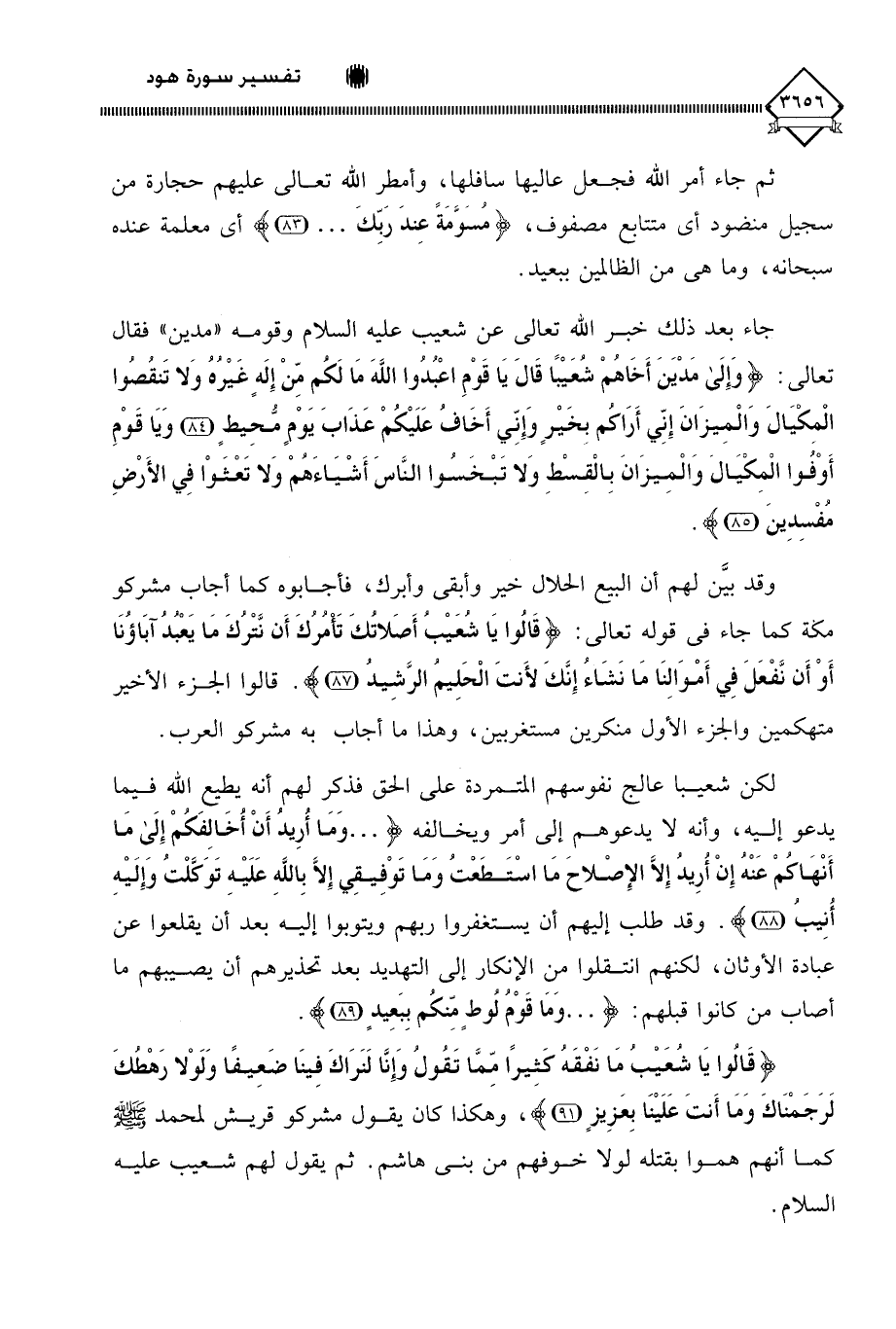 جاء بعد ذلك خبر اللَّه تعالى عن شعيب عليه السلام وقومه " مدين " فقال تعالى: (وَإِلَى مَدْيَنَ أَخَاهُمْ شُعَيْبًا قَالَ يَا قَوْمِ اعْبُدُوا اللَّهَ مَا لَكُمْ مِنْ إِلَهٍ غَيْرُهُ وَلَا تَنْقُصُوا الْمِكْيَالَ وَالْمِيزَانَ إِنِّي أَرَاكُمْ بِخَيْرٍ وَإِنِّي أَخَافُ عَلَيْكُمْ عَذَابَ يَوْمٍ مُحِيطٍ (84) وَيَا قَوْمِ أَوْفُوا الْمِكْيَالَ وَالْمِيزَانَ بِالْقِسْطِ وَلَا تَبْخَسُوا النَّاسَ أَشْيَاءَهُمْ وَلَا تَعْثَوْا فِي الْأَرْضِ مُفْسِدِينَ (85).