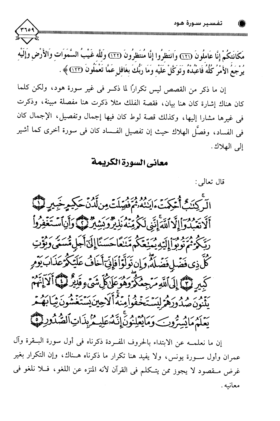 الر كِتَابٌ أُحْكِمَتْ آيَاتُهُ ثُمَّ فُصِّلَتْ مِنْ لَدُنْ حَكِيمٍ خَبِيرٍ (1) أَلَّا تَعْبُدُوا إِلَّا اللَّهَ إِنَّنِي لَكُمْ مِنْهُ نَذِيرٌ وَبَشِيرٌ (2) وَأَنِ اسْتَغْفِرُوا رَبَّكُمْ ثُمَّ تُوبُوا إِلَيْهِ يُمَتِّعْكُمْ مَتَاعًا حَسَنًا إِلَى أَجَلٍ مُسَمًّى وَيُؤْتِ كُلَّ ذِي فَضْلٍ فَضْلَهُ وَإِنْ تَوَلَّوْا فَإِنِّي أَخَافُ عَلَيْكُمْ عَذَابَ يَوْمٍ كَبِيرٍ (3) إِلَى اللَّهِ مَرْجِعُكُمْ وَهُوَ عَلَى كُلِّ شَيْءٍ قَدِيرٌ (4) أَلَا إِنَّهُمْ يَثْنُونَ صُدُورَهُمْ لِيَسْتَخْفُوا مِنْهُ أَلَا حِينَ يَسْتَغْشُونَ ثِيَابَهُمْ يَعْلَمُ مَا يُسِرُّونَ وَمَا يُعْلِنُونَ إِنَّهُ عَلِيمٌ بِذَاتِ الصُّدُورِ (5)