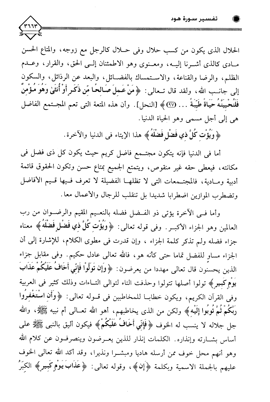 وأما في الآخرة يؤتي ذو الفضل فضله بالنعيم المقيم والرضوان من رب العالمين وهو الجزاء الأكبر. وفي قوله تعالى: (وَيُؤْتِ كُلَّ ذِي فَضْلٍ فَضْلَهُ) معناه جزاء فضله ولم تذكر كلمة الجزاء، وإن قدرت في مطوي الكلام، للإشارة إلى أن الجزاء مساوٍ للفضل تماما حتى كأنه هو، فاللَّه تعالى عادل حكيم. وفي مقابل جزاء الذين يحسنون قال تعالى مهددا من يعرضون: (وَإِن تَوَلَّوْا فَإِنِّي أَخَافُ عَلَيْكُمْ عَذَابَ يَوْمٍ كبِيرٍ) تولوا أصلها تتولوا وحذفت التاء لتوالي التاءات وذلك كثير في العربية وفى القرآن الكريم، ويكون خطابا للمخاطبين في قوله تعالى: (وَأَنِ اسْتَغْفِرُوا رَبَّكُمْ ثُمَّ تُوبُوا إِلَيْهِ) ولكن من الذي يخاطبهم، أهو اللَّه تعالى أم نبيه - صلى الله عليه وسلم -، واللَّه جل جلاله لَا ينسب له الخوف (فَإِنِّي أَخَافُ عَلَيْكُمْ) فيكون أليق بالنبي - صلى الله عليه وسلم - على أساس بشارته وإنذاره. الكلمات إنذار للذين يعرضون وينصرفون عن كلام اللَّه وهو أنهم محل خوف ممن أرسله هاديا ومبشرا ونذيرا، وقد أكد اللَّه تعالى الخوف عليهم بالجملة الاسمية وبكلمة (إن)، وقوله تعالى: (عَذَابَ يَوْمٍ كَبِيرٍ) الكِبَرُ