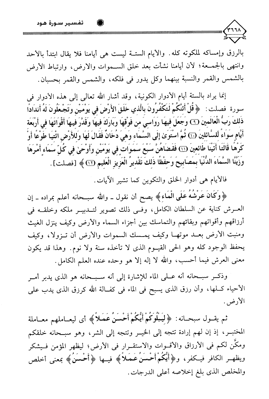 بالرزق وإمساكه لملكوته كله. والأيام الستة ليست هي أيامنا فلا يقال ابتدأ بالأحد وانتهى بالجمعة؛ لأن أيامنا نشأت بعد خلق السماوات وألارض، وارتباط الأرض بالشمس والقمر والنسبة بينهما وكل يدور في فلكه، والشمس والقمر بحسبان.