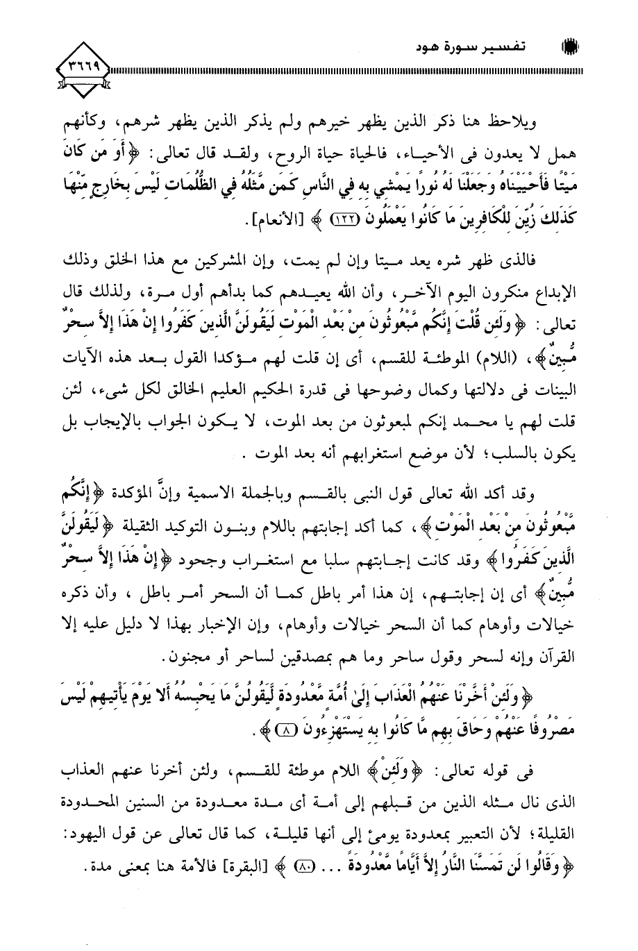وقد أكد اللَّه تعالى قول النبي بالقسم وبالجملة الاسمية وإن المؤكدة (إِنَّكُم مبْعُوثُونَ مِنْ بَعْدِ الْمَوْتِ)، كما أكد إجابتهم باللام وبنون التوكيد الثقيلة (لَيَقُولَنَّ الَّذِينَ كَفَرُوا) وقد كانت إجابتهم سلبا مع استغراب وجحود (إِنْ هَذَا إِلَّا سِحْرٌ مُّبِين) أي إن إجابتهم، إن هذا أمر باطل كما أن السحر أمر باطل، وأن ذكره خيالات وأوهام كما أن السحر خيالات وأوهام، وإن الإخبار بهذا لَا دليل عليه إلا القرآن وإنه لسحر وقول ساحر وما هم بمصدقين لساحر أو مجنون.