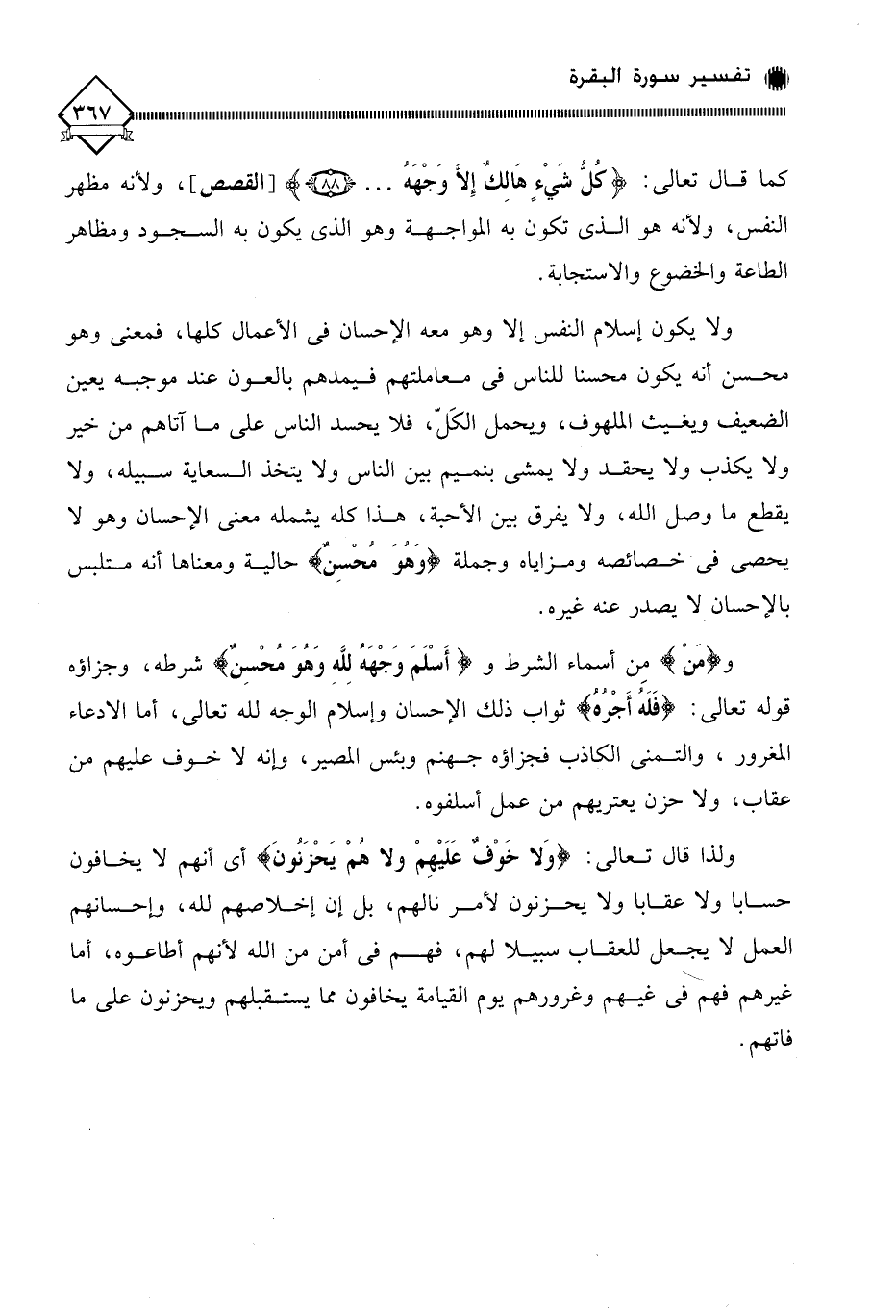 و (مَنْ) مِن أسماء الشرط و (أَسْلَمَ وَجْهَهُ لِلَّهِ وَهُوَ مُحْسِنٌ) شرطه، وجزاؤه قوله تعالى: (فَلَهُ أَجْرُهُ) ثواب ذلك الإحسان وإسلام الوجه لله تعالى، أما الادعاء المغرور، والتمني الكاذب فجزاؤه جهنم وبئس المصير، وإنه لَا خوف عليهم من عقاب، ولا حزن يعتريهم من عمل أسلفوه.