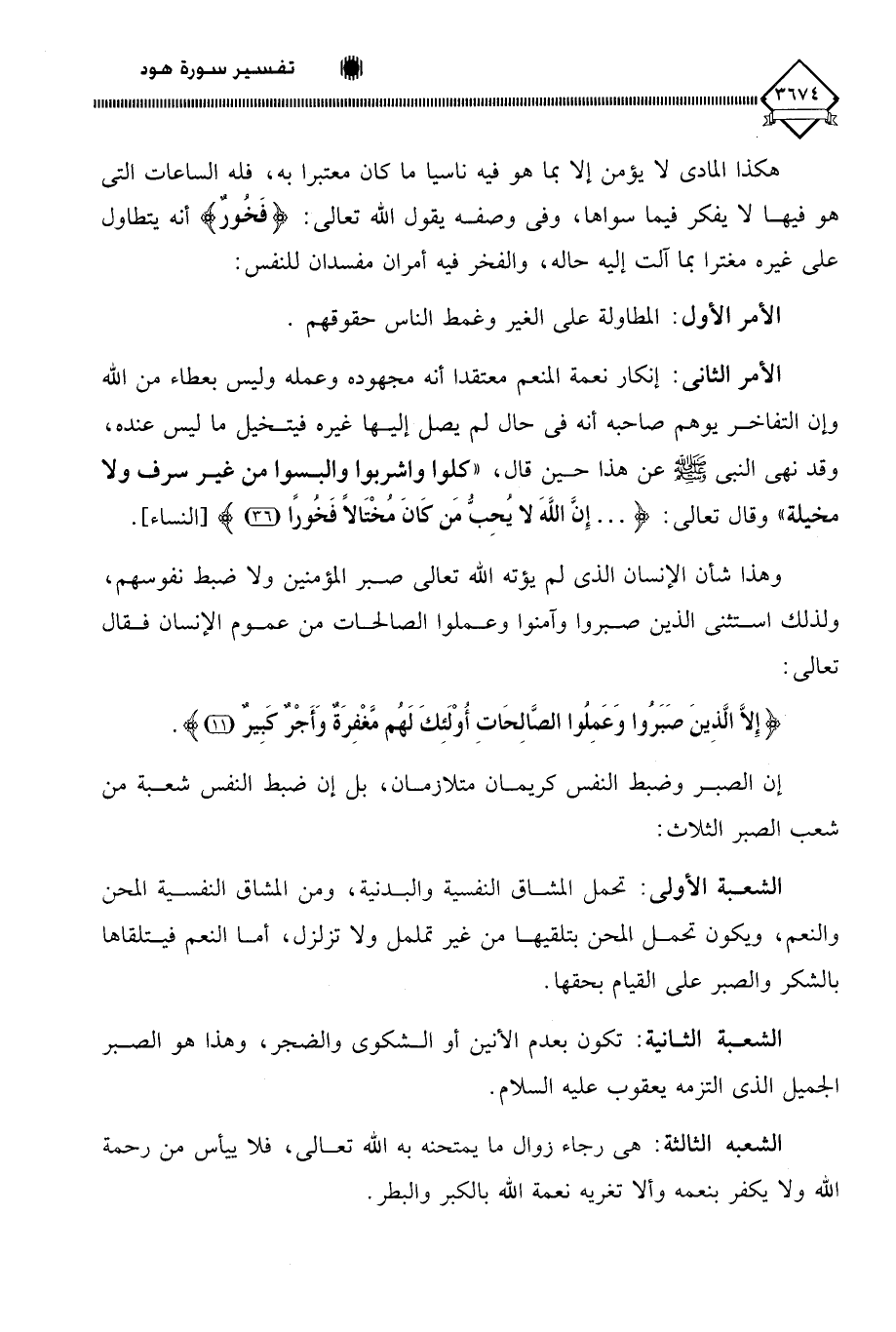 هكذا المادي لَا يؤمن إلا بما هو فيه ناسيا ما كان معتبرا به، فله الساعات التي هو فيها لَا يفكر فيما سواها، وفي وصفه يقول اللَّه تعالى: (فَخُورٌ) أنه يتطاول على غيره مغترا بما آلت إليه حاله، والفخر فيه أمران مفسدان للنفس: