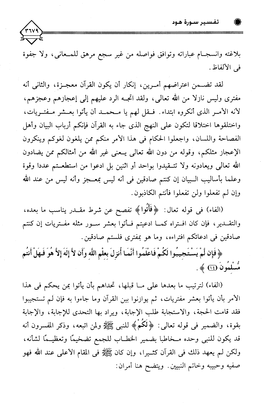 (الفاء) في قوله تعال: (فَأْتُوا) تفصح عن شرط مقدر يناسب ما بعده، والتقدير، فإن كان افتراه كما ادعيتم فأتوا بعشر سور مثله مفتريات إن كنتم صادقين في ادعائكم افتراءه، وما هو بمفترى فلستم صادقين.