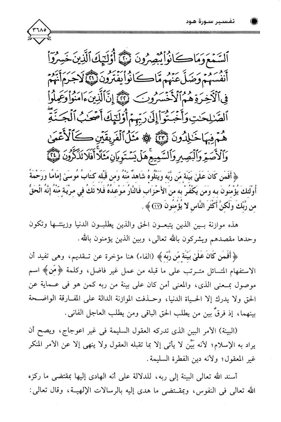 (أَفَمَنْ كَانَ عَلَى بَيِّنَةٍ مِنْ رَبِّهِ وَيَتْلُوهُ شَاهِدٌ مِنْهُ وَمِنْ قَبْلِهِ كِتَابُ مُوسَى إِمَامًا وَرَحْمَةً أُولَئِكَ يُؤْمِنُونَ بِهِ وَمَنْ يَكْفُرْ بِهِ مِنَ الْأَحْزَابِ فَالنَّارُ مَوْعِدُهُ فَلَا تَكُ فِي مِرْيَةٍ مِنْهُ إِنَّهُ الْحَقُّ مِنْ رَبِّكَ وَلَكِنَّ أَكْثَرَ النَّاسِ لَا يُؤْمِنُونَ (17)