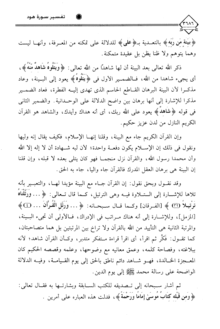 ذكر اللَّه تعالى بعد البينة أن لها شاهدًا من اللَّه تعالى: (وَيَتْلُوهُ شَاهِدٌ مِنْهُ)، أي يجيء شاهدا من اللَّه، فالضمير الأول في (يَتْلُوهُ) يعود إلى البينة، وعاد مذكرا لأن البينة البرهان القاطع الحاسم الذي تهدي إليه الفطرة، فعاد الضمير مذكرا للإشارة إلى أنها برهان بين واضح الدلالة على الوحدانية. والضمير الثاني في قوله (شَاهِدٌ) يعود على اللَّه ربك، أي أنه هداك وأيدك، والشاهد هو القرآن الكريم النازل من لدن عزيز حكيم.