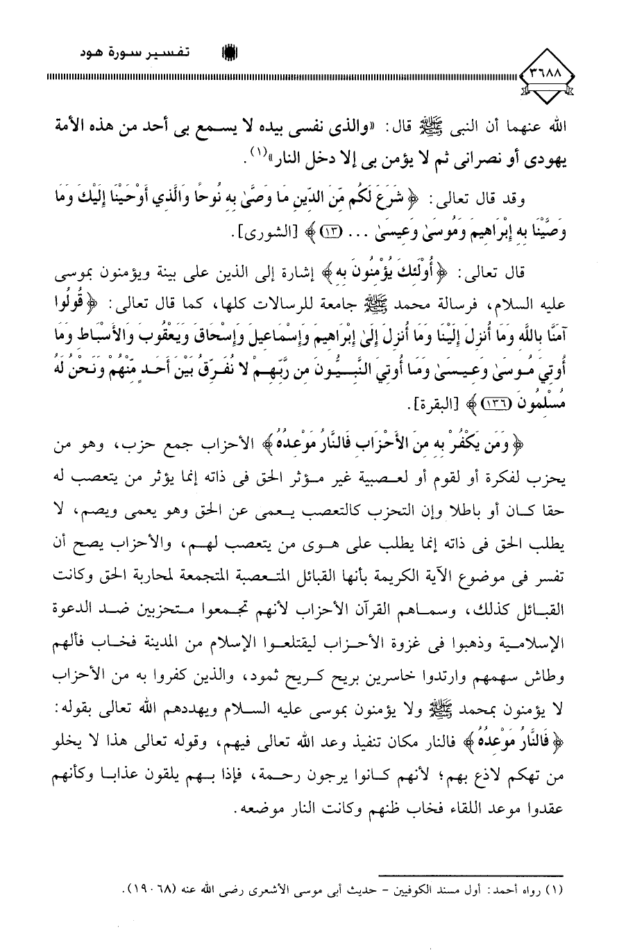 (وَمَن يَكْفُرْ بِهِ مِنَ الأَحْزَابِ فَالنَّارُ مَوْعِدُهُ) الأحزاب جمع حزب، وهو من يحزب لفكرة أو لقوم أو لعصبية غير مؤثر الحق في ذاته إنما يؤثر من يتعصب له حقا كان أو باطلا وإن التحزب كالتعصب يعمي عن الحق وهو يعمي ويصم، لا يطلب الحق في ذاته إنما يطلب على هوى من يتعصب لهم، والأحزاب يصح أن تفسر في موضوع الآية الكريمة بأنها القبائل التعصبة المتجمعة لمحاربة الحق وكانت القبائل كذلك، وسماهم القرآن الأحزاب لأنهم تجمعوا متحزبين ضد الدعوة الإسلامية وذهبوا في غزوة الأحزاب ليقتلعوا الإسلام من المدينة فخاب فألهم وطاش سهمهم وارتدوا خاسرين بريح كريح ثمود، والذين كفروا به من الأحزاب لا يؤمنون بمحمد - صلى الله عليه وسلم - ولا يؤمنون بموسى عليه السلام ويهددهم اللَّه تعالى بقوله: (فالنَّارُ مَوْعِدُهُ) فالنار مكان تنفيذ وعد اللَّه تعالى فيهم، وقوله تعالى هذا لَا يخلو من تهكم لاذع بهم؛ لأنهم كانوا يرجون رحمة، فإذا بهم يلقون عذابا وكأنهم عقدوا موعد اللقاء فخاب ظنهم وكانت النار موضعه.