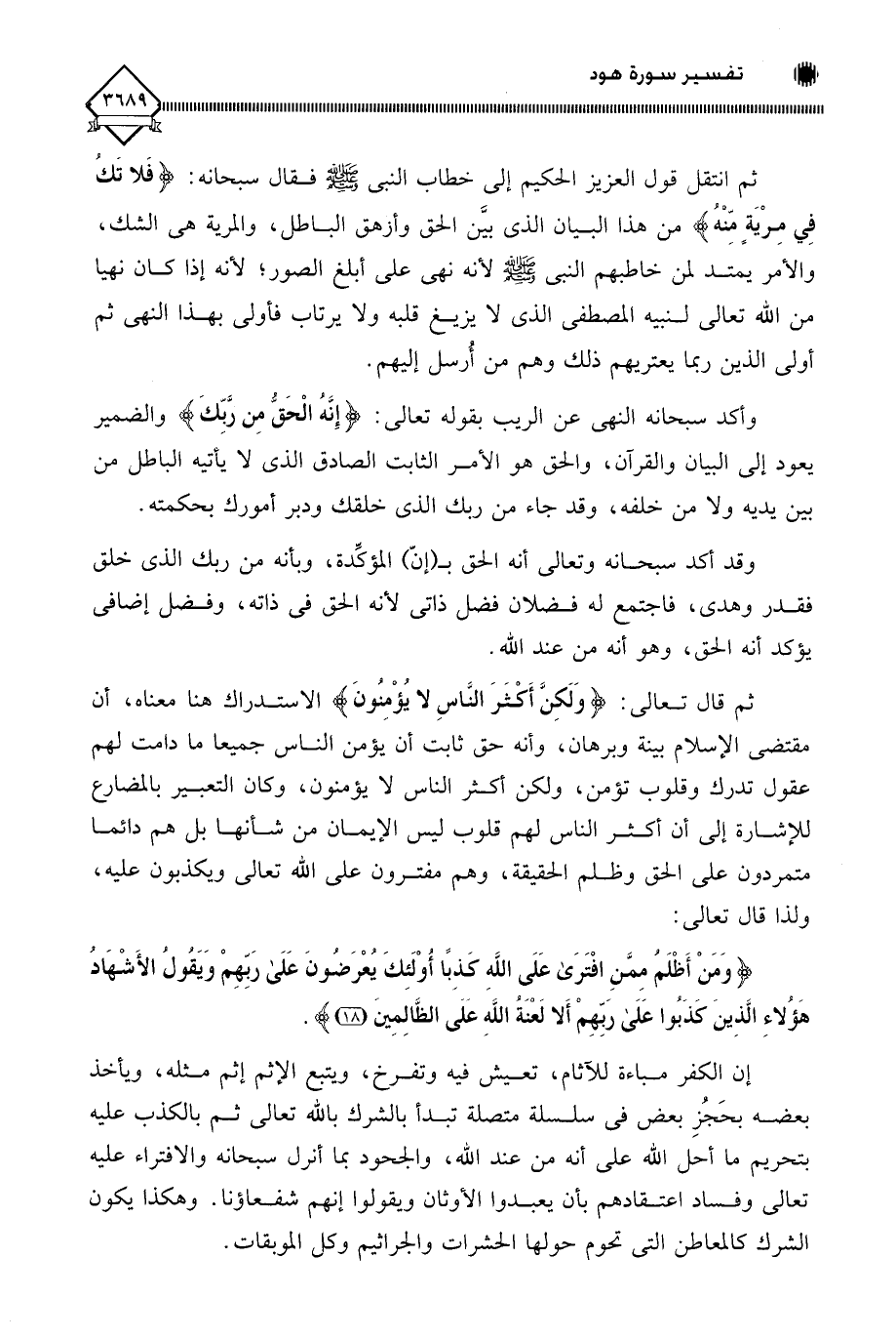 ثم انتقل قول العزيز الحكيم إلى خطاب النبي - صلى الله عليه وسلم - فقال سبحانه: (فَلا تَكُ فِي مِرْيَةٍ مِنْهُ) من هذا البيان الذي بيَّن الحق وأزهق الباطل، والمرية هي الشك، والأمر يمتد لمن خاطبهم النبي - صلى الله عليه وسلم - لأنه نهي على أبلغ الصور؛ لأنه إذا كان نهيا من اللَّه تعالى لنبيه المصطفى الذي لَا يزيغ قلبه ولا يرتاب فأولى بهذا النهي ثم أولى الذين ربما يعتريهم ذلك وهم من أُرسل إليهم.