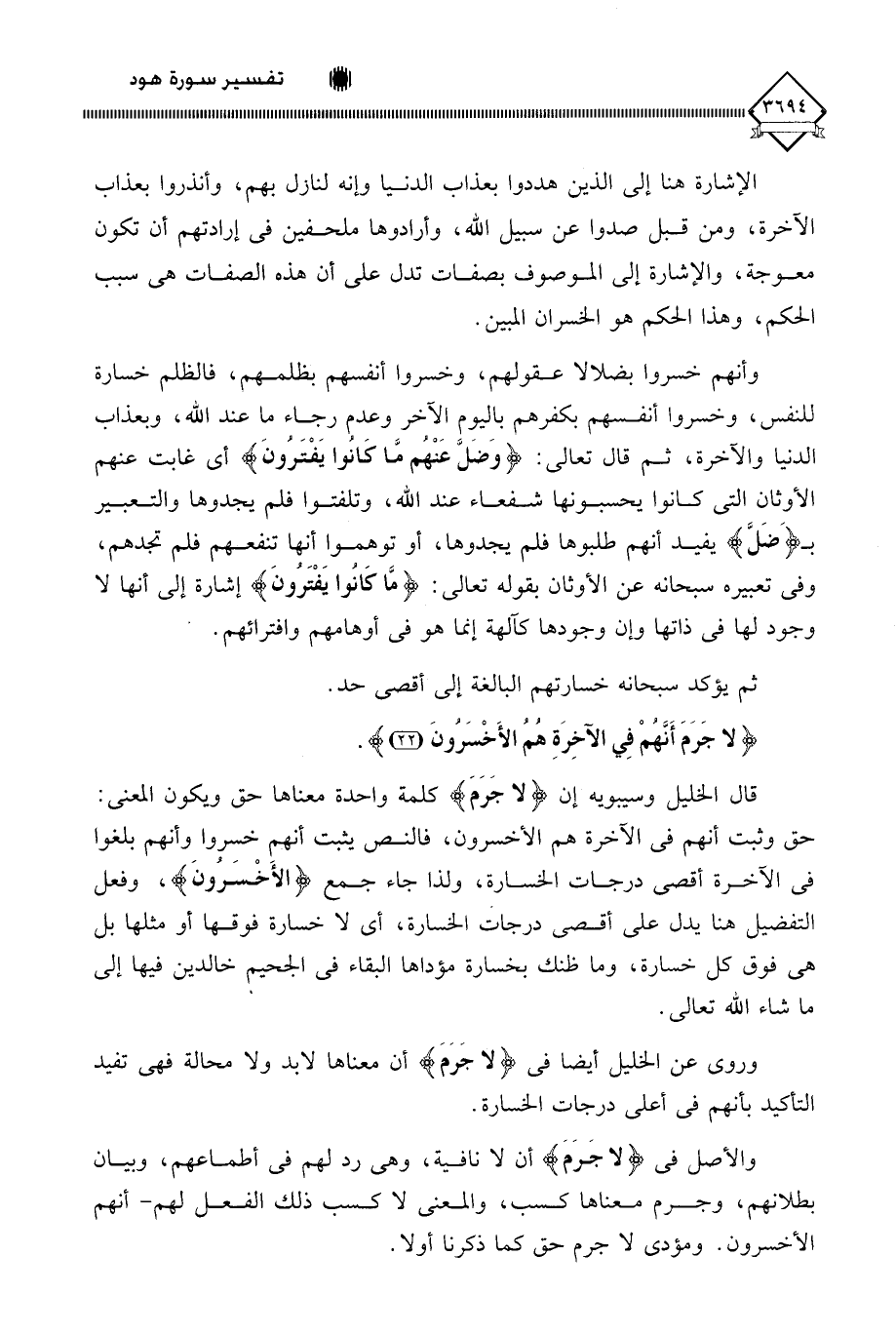 حق وثبت أنهم في الآخرة هم الأخسرون، فالنص يثبت أنهم خسروا وأنهم بلغوا في الآخرة أقصى درجات الخسارة، ولذا جاء جمع (الأَخْسَرُونَ)، وفعل التفضيل هنا يدل على أقصى درجات الخسارة، أي لَا خسارة فوقها أو مثلها بل هي فوق كل خسارة، وما ظنك بخسارة مؤداها البقاء في الجحيبم خالدين فيها إلى ما شاء اللَّه تعالى.