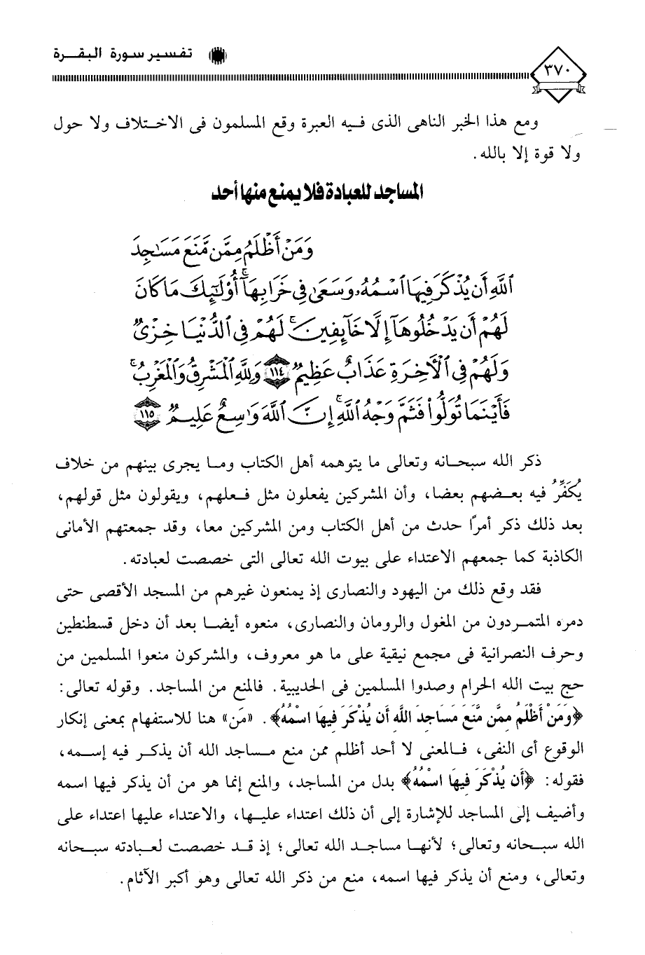 (وَمَنْ أَظْلَمُ مِمَّنْ مَنَعَ مَسَاجِدَ اللَّهِ أَنْ يُذْكَرَ فِيهَا اسْمُهُ وَسَعَى فِي خَرَابِهَا أُولَئِكَ مَا كَانَ لَهُمْ أَنْ يَدْخُلُوهَا إِلَّا خَائِفِينَ لَهُمْ فِي الدُّنْيَا خِزْيٌ وَلَهُمْ فِي الْآخِرَةِ عَذَابٌ عَظِيمٌ (114) وَلِلَّهِ الْمَشْرِقُ وَالْمَغْرِبُ فَأَيْنَمَا تُوَلُّوا فَثَمَّ وَجْهُ اللَّهِ إِنَّ اللَّهَ وَاسِعٌ عَلِيمٌ (115)