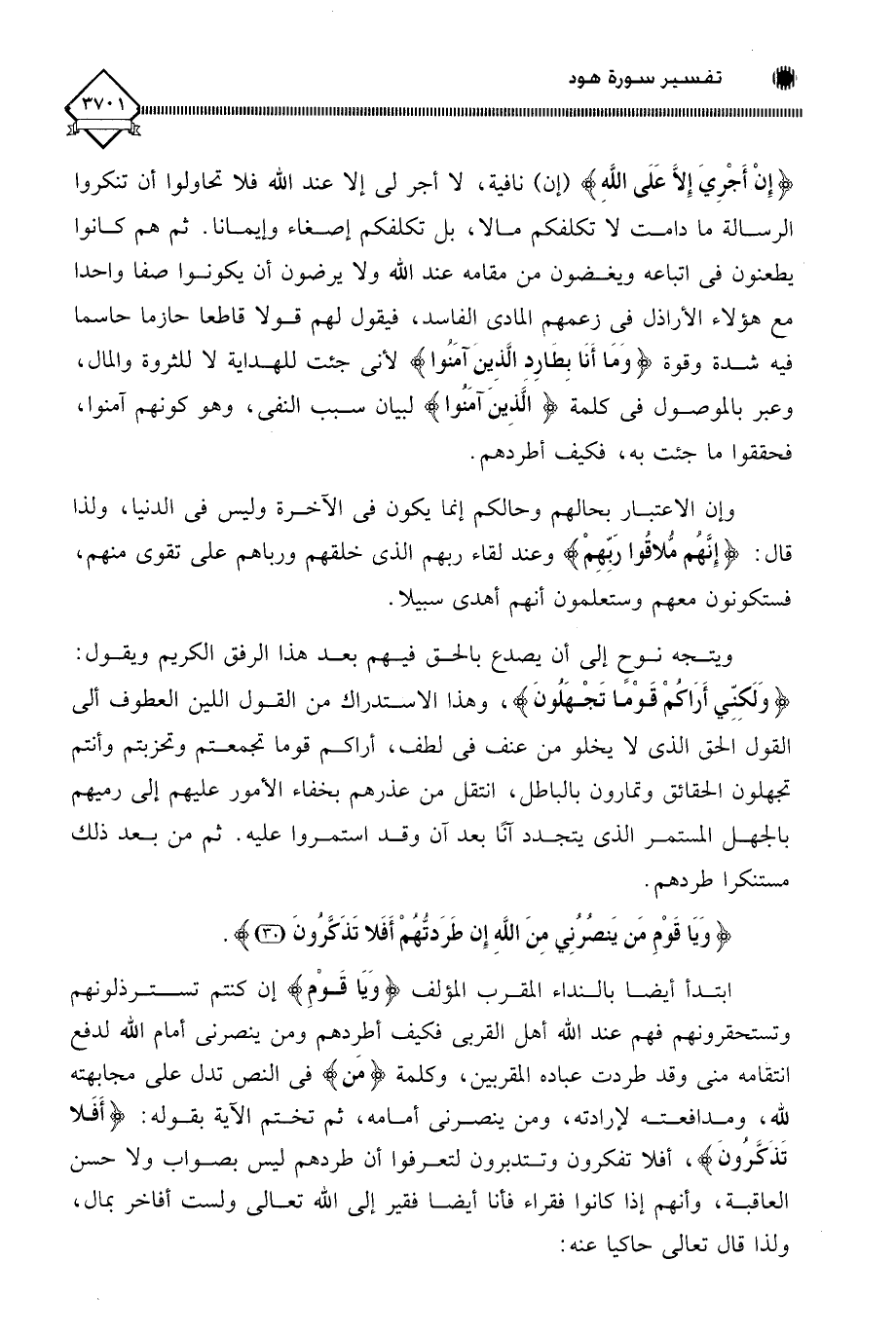 (إِنْ أَجْرِيَ إِلَّا عَلَى اللَّهِ) (إن) نافية، لَا أجر لي إلا عند اللَّه فلا تحاولوا أن تنكروا الرسالة ما دامت لَا تكلفكم مالا، بل تكلفكم إصغاء وإيمانا. ثم هم كانوا يطعنون في اتباعه ويغضون من مقامه عند اللَّه ولا يرضون أن يكونوا صفا واحدا مع هؤلاء الأراذل في زعمهم المادي الفاسد، فيقول لهم قولا قاطعا حازما حاسما فيه شدة وقوة (وَمَا أنا بطارِد الَّذِين آمَنوا) لأني جئت للهداية لَا للثروة والمال، وعبر بالموصول في كلمةَ (الًّذِينَ آمَنوا) لبيان سبب النفي، وهو كونهم آمنوا، فحققوا ما جئت به، فكيف أطردهم.