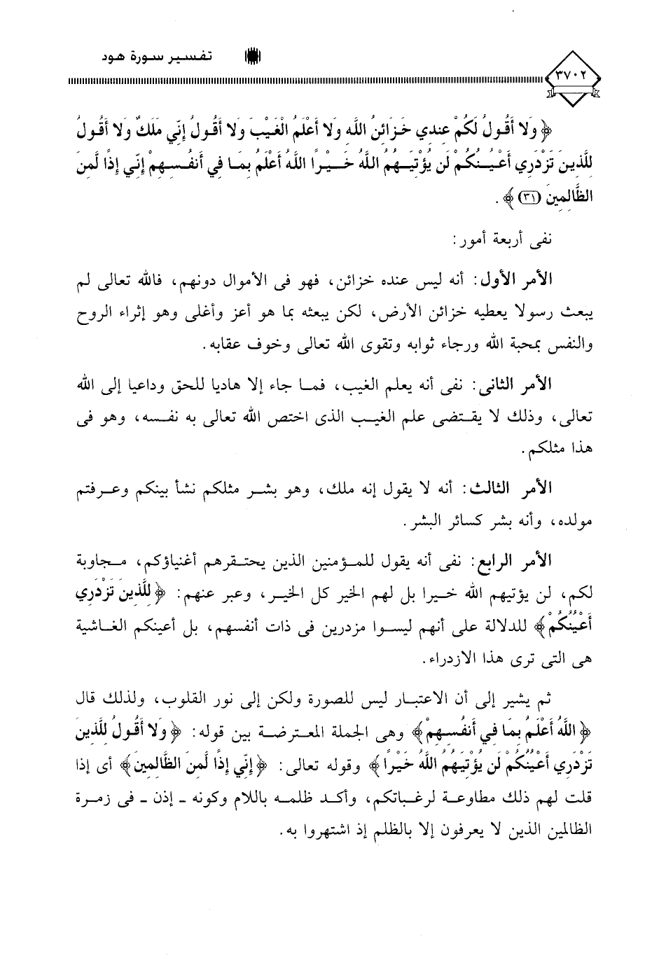 (وَلَا أَقُولُ لَكُمْ عِنْدِي خَزَائِنُ اللَّهِ وَلَا أَعْلَمُ الْغَيْبَ وَلَا أَقُولُ إِنِّي مَلَكٌ وَلَا أَقُولُ لِلَّذِينَ تَزْدَرِي أَعْيُنُكُمْ لَنْ يُؤْتِيَهُمُ اللَّهُ خَيْرًا اللَّهُ أَعْلَمُ بِمَا فِي أَنْفُسِهِمْ إِنِّي إِذًا لَمِنَ الظَّالِمِينَ (31)