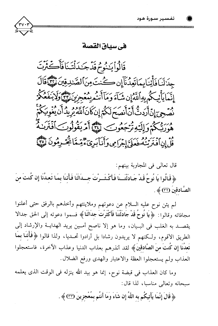 (قَالُوا يَا نُوحُ قَدْ جَادَلْتَنَا فَأَكْثَرْتَ جِدَالَنَا فَأْتِنَا بِمَا تَعِدُنَا إِنْ كُنْتَ مِنَ الصَّادِقِينَ (32) قَالَ إِنَّمَا يَأْتِيكُمْ بِهِ اللَّهُ إِنْ شَاءَ وَمَا أَنْتُمْ بِمُعْجِزِينَ (33) وَلَا يَنْفَعُكُمْ نُصْحِي إِنْ أَرَدْتُ أَنْ أَنْصَحَ لَكُمْ إِنْ كَانَ اللَّهُ يُرِيدُ أَنْ يُغْوِيَكُمْ هُوَ رَبُّكُمْ وَإِلَيْهِ تُرْجَعُونَ (34) أَمْ يَقُولُونَ افْتَرَاهُ قُلْ إِنِ افْتَرَيْتُهُ فَعَلَيَّ إِجْرَامِي وَأَنَا بَرِيءٌ مِمَّا تُجْرِمُونَ (35)