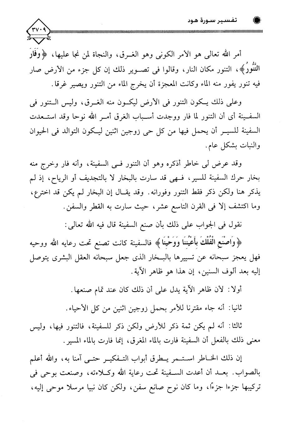 وقد عرض لي خاطر أذكره وهو أن التنور في السفينة، وأنه فار وخرج منه بخار حرك السفينة للسير، فهي قد سارت بالبخار لَا بالتجديف أو الرياح، إذ لم يذكر هنا ولكن ذكر فقط التنور وفورانه. وقد يقال إن البخار لم يكن قد اخترع، وما اكتشف إلا في القرن التاسع عشر، حيث سارت به القطر والسفن.