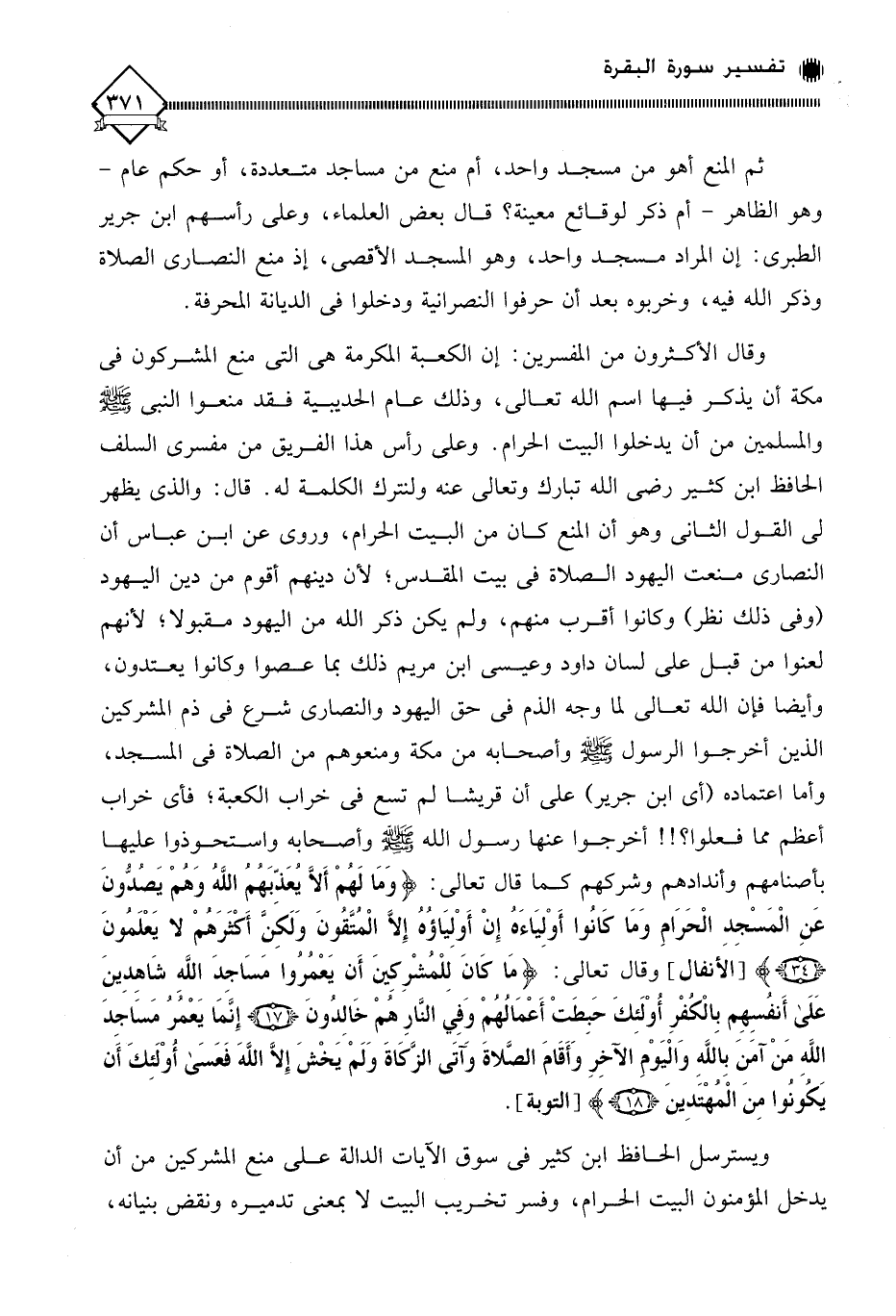 ويسترسل الحافظ ابن كثير في سوق الآيات الدالة على منع المشركين من أن يدخل المؤمنون البيت الحرام، وفسر تخريب البيت لَا بمعنى تدميره ونقض بنيانه،