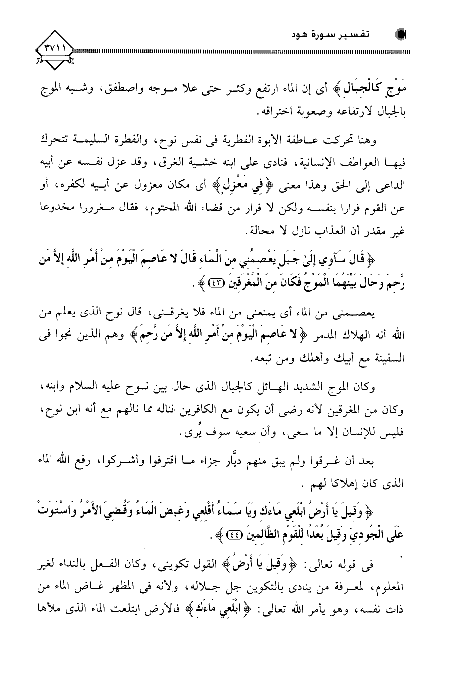 وهنا تحركت عاطفة الأبوة الفطرية في نفس نوح، والفطرة السليمة تتحرك فيها العواطف الإنسانية، فنادى على ابنه خشية الغرق، وقد عزل نفسه عن أبيه الداعي إلى الحق وهذا معنى (فِي معْزِلٍ) أي مكان معزول عن أبيه لكفره، أو عن القوم فرارا بنفسه ولكن لَا فرار من قضاء اللَّه المحتوم، فقال مغرورا مخدوعا غير مقدر أن العذاب نازل لَا محالة.