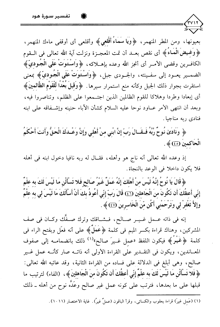 بعيونها، ومن المطر المنهمر، (وَيَا سَمَاءُ أَقْلِعِي) وأقلعي أي أوقفي ماءك المنهمر، (وَغِيضَ الْمَاءُ) أي نقص بعد أن تمت المعجزة ونزلت آية اللَّه تعالى في القوم الكافرين وقُضي الأمر أي أنجز اللَّه وعده بإهلاكه، (وَاسْتَوَتْ عَلَى الْجُودِيِّ) الضمير يعود إلى سفينته، و (الْجُودِيِّ) جبل، (وَاسْتَوَتْ عَلَى الْجُودِيِّ) بمعنى استقرت بجوار ذلك الجبل وكأنه منع استمرار سيرها. (وَقِيلَ بُعْدًا لِلْقَوْمِ الظَّالِمِينَ) أي إبعادا وطردا وهلاكا للقوم الظالمين الذين اجتمعوا على الظلم، وتناصروا فيه، وبعد أن انتهى الأمر عاود نوحًا عليه السلام كشأن الآباء حنينُه وإشفاقُه على ابنه فنادى ربه مناجيا.