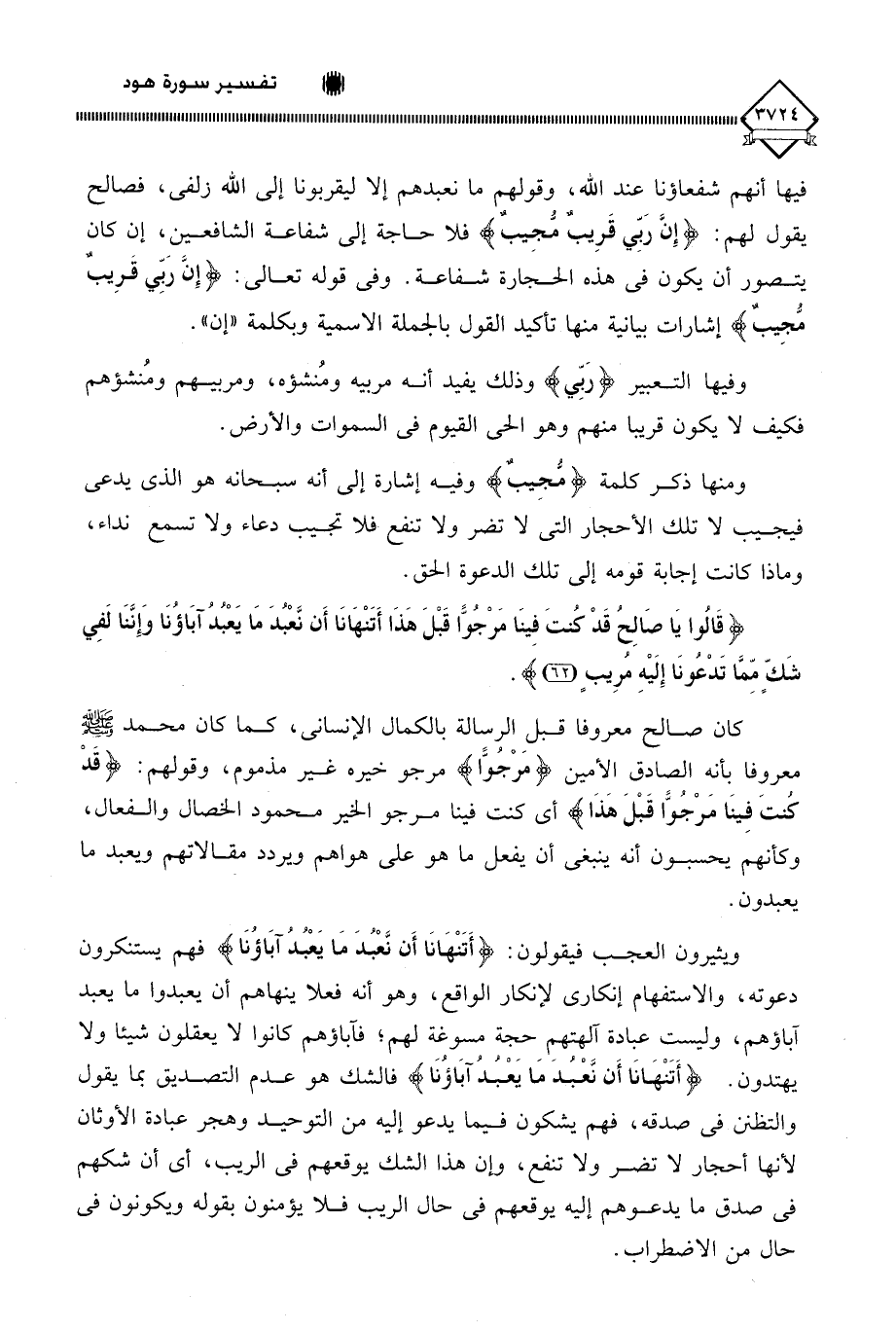 فيها أنهم شفعاؤنا عند اللَّه، وقولهم ما نعبدهم إلا ليقربونا إلى اللَّه زلفى، فصالح يقول لهم: (إِنَّ رَبِّي قَرِيبٌ مجِيب) فلا حاجة إلى شفاعة الشافعين، إن كان يتصور أن يكون في هذه الحجارة شفاعة. وفي قوله تعالى: (إِنَّ رَبِّي قَرِيبٌ مُّجِيب) إشارات بيانية منها تأكيد القول بالجملة الاسمية وبكلمة " إن ".