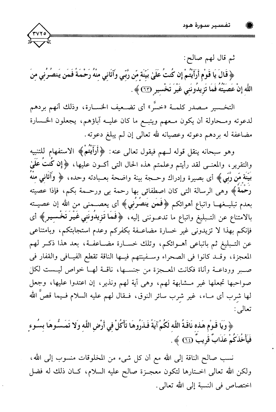 وهو سبحانه ينقل قوله لهم فيقول تعالى عنه: (أَرَأَيْتمْ) الاستفهام للتنبيه والتقرير، والمعنى لقد رأيتم وعلمتم هذه الحال التي أكون عليها، (إِن كنتُ عَلَى بَيِّنَةٍ مِّن رَّبِّي) أي بصيرة وإدراك وحجة بينة واضحة بعبادته وحده، (وَآتَانِي مِنْهُ رَحْمَةً) وهي الرسالة التي كان اصطفائي بها رحمة بي ورحمة بكم، فإذا عصيته بعدم تبليغها واتباع أهوائكم (فَمَن يَنصُرنِي) أي يعصمنِي من اللَّه إن عصيته بالامتناع عن التبليغ واتباع ما تدعونني إليه، (فَمَا تَزِيدُوننِي غَيْرَ تَخْسِيرٍ) أي فإنكم بهذا لَا تزيدوني غير خسارة مضاعفة بكفركم وعدم استجابتكم، وبامتناعي عن التبليغ ثم باتباعي أهوائكم، وتلك خسارة مضاعفة، بعد هذا ذكر لهم المعجزة، وقد كانوا في الصحراء وسفينتهم فيها الناقة تقطع الفيافي والقفار في صبر ووداعة وأناة فكانت المعجزة من جنسها، ناقة لها خواص ليست لكل صواحبها تجعلها غير مشابهة لهم، وهي آية لهم ونذير، إن اعتدوا عليها، وجعل لها شِرب أي ماء، غير شِرب سائر النوق، فقال لهم عليه السلام فيما قصَّ اللَّه تعالى:
