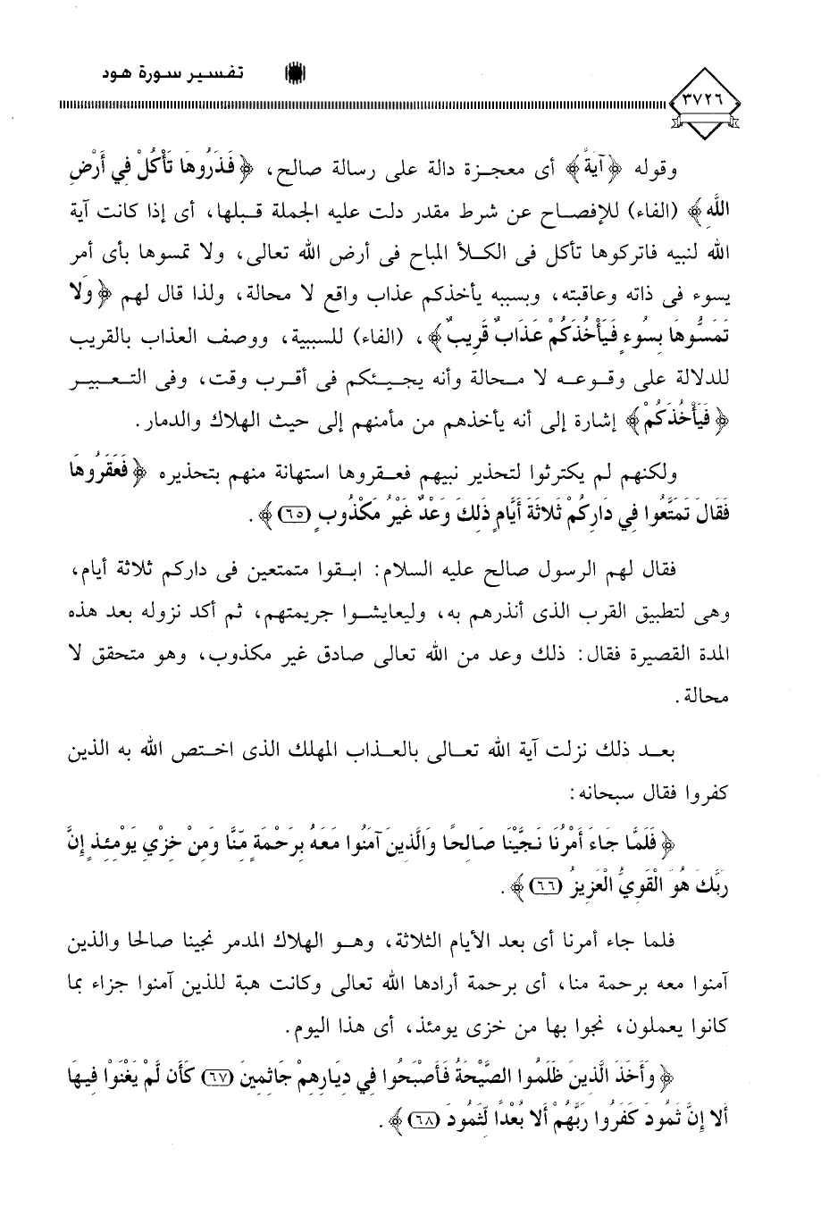 وقوله (آيةً) فهو أي معجزة دالة على رسالة صالح، (فَذَرُوهَا تَأْكل فِي أَرضِ اللَّهِ) (الفاء) للإفصاح عن شرط مقدر دلت عليه الجملة قبلها، أي إذا كانت آية الله لنبيه فاتركوها تأكل في الكلأ المباح في أرض الله تعالى، ولا تمسوها بأي أمر يسوء في ذاته وعاقبته، وبسببه يأخذكم عذاب واقع لَا محالة، ولذا قال لهم (وَلا تَمَسُّوهَا بِسُوءٍ فَيَأْخُذَكُمْ عَذَابٌ قَرِيبٌ)، (الفاء) للسببية، ووصف العذاب بالقريب للدلالة على وقوعه لَا محالة وأنه يجيئكم في أقرب وقت، وفي التعبير (فَيَأْخُذَكُمْ) إشارة إلى أنه يأخذهم من مأمنهم إلى حيث الهلاك والدمار.