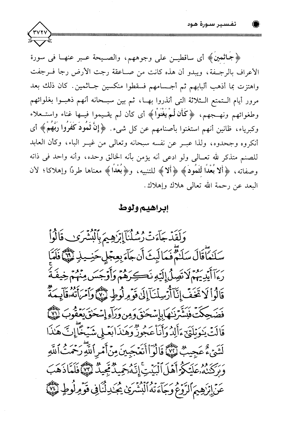 (وَلَقَدْ جَاءَتْ رُسُلُنَا إِبْرَاهِيمَ بِالْبُشْرَى قَالُوا سَلَامًا قَالَ سَلَامٌ فَمَا لَبِثَ أَنْ جَاءَ بِعِجْلٍ حَنِيذٍ (69) فَلَمَّا رَأَى أَيْدِيَهُمْ لَا تَصِلُ إِلَيْهِ نَكِرَهُمْ وَأَوْجَسَ مِنْهُمْ خِيفَةً قَالُوا لَا تَخَفْ إِنَّا أُرْسِلْنَا إِلَى قَوْمِ لُوطٍ (70) وَامْرَأَتُهُ قَائِمَةٌ فَضَحِكَتْ فَبَشَّرْنَاهَا بِإِسْحَاقَ وَمِنْ وَرَاءِ إِسْحَاقَ يَعْقُوبَ (71) قَالَتْ يَا وَيْلَتَى أَأَلِدُ وَأَنَا عَجُوزٌ وَهَذَا بَعْلِي شَيْخًا إِنَّ هَذَا لَشَيْءٌ عَجِيبٌ (72) قَالُوا أَتَعْجَبِينَ مِنْ أَمْرِ اللَّهِ رَحْمَتُ اللَّهِ وَبَرَكَاتُهُ عَلَيْكُمْ أَهْلَ الْبَيْتِ إِنَّهُ حَمِيدٌ مَجِيدٌ (73) فَلَمَّا ذَهَبَ عَنْ إِبْرَاهِيمَ الرَّوْعُ وَجَاءَتْهُ الْبُشْرَى يُجَادِلُنَا فِي قَوْمِ لُوطٍ (74)