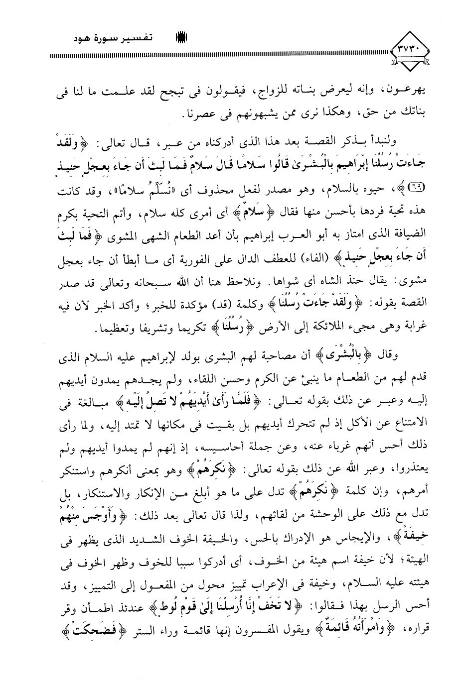 ولنبدأ بذكر القصة بعد هذا الذي أدركناه من عبر، قال تعالى: (وَلَقَدْ جَاءَتْ رُسُلُنَا إِبْرَاهِيمَ بِالْبُشْرَى قَالُوا سَلَامًا قَالَ سَلَامٌ فَمَا لَبِثَ أَنْ جَاءَ بِعِجْلٍ حَنِيذٍ)، حيوه بالسلام، وهو مصدر لفعل محذوف أي " نُسَلِّمُ سلامًا "، وقد كانت هذه تحية فردها بأحسن منها فقال (سَلامٌ) أي أمري كله سلام، وأتم التحية بكرم الضيافة الذي امتاز به أبو العرب إبراهيم بأن أعد الطعام الشهي المشوي (فَمَا لَبِثَ أَن جَاءَ بِعِجْلٍ حَنيذٍ) (الفاء) للعطف الدال على الفورية أي ما أبطأ أن جاء بعجل مشوي: يقال حنذ الشاه أي شواها. ونلاحظ هنا أن اللَّه سبحانه وتعالى قد صدر القصة بقوله: (وَلَقَدْ جَاءَتْ رُسُلُنَا) وكلمة (قد) مؤكدة للخبر؛ وأكد الخبر لأن فيه غرابة وهي مجيء الملائكة إلى الأرض (رُسُلُنَا) تكريما وتشريفا وتعظيما.
