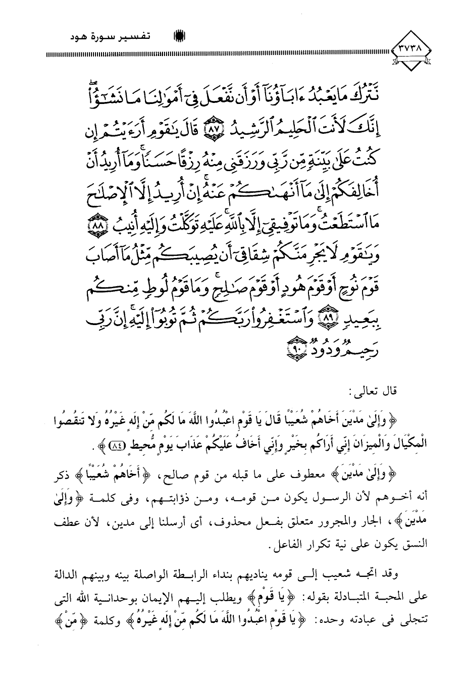 (وَإِلَى مَدْيَنَ) معطوف على ما قبله من قوم صالح، (أَخَاهُمْ شُعَيْبًا) ذكر أنه أخوهم لأن الرسول يكون من قومه، ومن ذؤابتهم، وفي كلمة (وَإِلَى مَدْيَنَ)، الجار والمجرور متعلق بفعل محذوف، أي أرسلنا إلى مدين، لأن عطف النسق يكون على نية تكرار الفاعل.