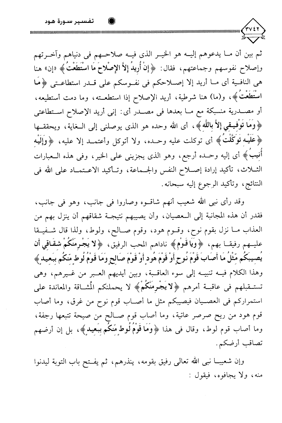 ثم بين أن ما يدعوهم إليه هو الخير الذي فيه صلاحهم في دنياهم وآخرتهم وإصلاح نفوسهم وجماعتهم، فقال: (إِنْ أُرِيدُ إِلَّا الْإِصْلَاحَ مَا اسْتَطَعْتُ) " إن " هنا هي النافية أي ما أريد إلا إصلاحكم في نفوسكم على قدر استطاعتي (مَا اسْتَطَعْتُ)، و (ما) هنا شرطية، أريد الإصلاح إذا استطعته، وما دمت أستطيعه، أو مصدرية منسبكة مع ما بعدها في مصدر أي: إني أريد الإصلاح استطاعتي (وَمَا تَوْفِيقِي إِلَّا بِاللَّهِ)، أي اللَّه وحده هو الذي يوصلني إلى الغاية، ويحققها (علَيْهِ تَوَكَّلْتُ) أي توكلت عليه وحده، ولا أتوكل وأعتمد إلا عليه، (وَإلَيْهِ أُنيبُ) أي إليه وحده أرجع، وهو الذي يجزيني على الخير، وفي هذه العبارات الثلاث، تأكيد إرادة إصلاح النفس والجماعة، وتأكيد الاعتماد على اللَّه في النتائج، وتأكيد الرجوع إليه سبحانه.