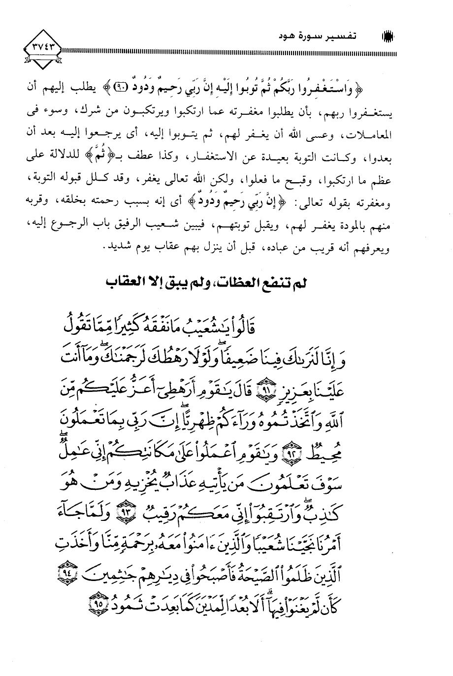 (قَالُوا يَا شُعَيْبُ مَا نَفْقَهُ كَثِيرًا مِمَّا تَقُولُ وَإِنَّا لَنَرَاكَ فِينَا ضَعِيفًا وَلَوْلَا رَهْطُكَ لَرَجَمْنَاكَ وَمَا أَنْتَ عَلَيْنَا بِعَزِيزٍ (91) قَالَ يَا قَوْمِ أَرَهْطِي أَعَزُّ عَلَيْكُمْ مِنَ اللَّهِ وَاتَّخَذْتُمُوهُ وَرَاءَكُمْ ظِهْرِيًّا إِنَّ رَبِّي بِمَا تَعْمَلُونَ مُحِيطٌ (92) وَيَا قَوْمِ اعْمَلُوا عَلَى مَكَانَتِكُمْ إِنِّي عَامِلٌ سَوْفَ تَعْلَمُونَ مَنْ يَأْتِيهِ عَذَابٌ يُخْزِيهِ وَمَنْ هُوَ كَاذِبٌ وَارْتَقِبُوا إِنِّي مَعَكُمْ رَقِيبٌ (93) وَلَمَّا جَاءَ أَمْرُنَا نَجَّيْنَا شُعَيْبًا وَالَّذِينَ آمَنُوا مَعَهُ بِرَحْمَةٍ مِنَّا وَأَخَذَتِ الَّذِينَ ظَلَمُوا الصَّيْحَةُ فَأَصْبَحُوا فِي دِيَارِهِمْ جَاثِمِينَ (94) كَأَنْ لَمْ يَغْنَوْا فِيهَا أَلَا بُعْدًا لِمَدْيَنَ كَمَا بَعِدَتْ ثَمُودُ (95)