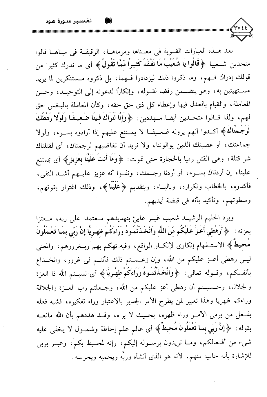 (أَرَهْطِي أَعَزُّ عَلَيْكُمْ مِنَ اللَّهِ وَاتَّخَذْتُمُوهُ وَرَاءَكُمْ ظِهْرِيًّا إِنَّ رَبِّي بِمَا تَعْمَلُونَ مُحِيطٌ (92) الاستفهام إنكاري لإنكار الواقع، وفيه تهكم بهم وبغرورهم، والمعنى ليس رهطي أعز عليكم من اللَّه، وإن زعمتم ذلك فأنتم في غرور، وانخداع بأنفسكم، وقوله تعالى: (وَاتَّخَذْتُمُوهُ وَرَاءَكُمْ ظِهْرِيًّا) أي نسيتم اللَّه ذا العزة والجلال، وحسبتم أن رهطي أعز عليكم من اللَّه، وجعلتم رب العزة والجلالة وراءكم ظهريا وهذا تعبير لمن يطرح الأمر الجدير بالاعتبار وراء تفكيره، فشبه فعله بفعل من يرمي الأمر وراء ظهره، بحيث لَا يراه، وقد هددهم بأن الله مانعه بقوله: (إِنَّ رَبِّي بِمَا تَعْمَلُونَ مُحِيطٌ) أي عالم علم إحاطة وشمول لَا يخفى عليه شيء من أفعالكم، وما تريدون برسوله إليكم، وإنه لمحيط بكم، وعبر بـ ربي للإشارة بأنه حاميه منهم، لأنه هو الذي أنشأه وربَّه ويحميه ويحرسه.