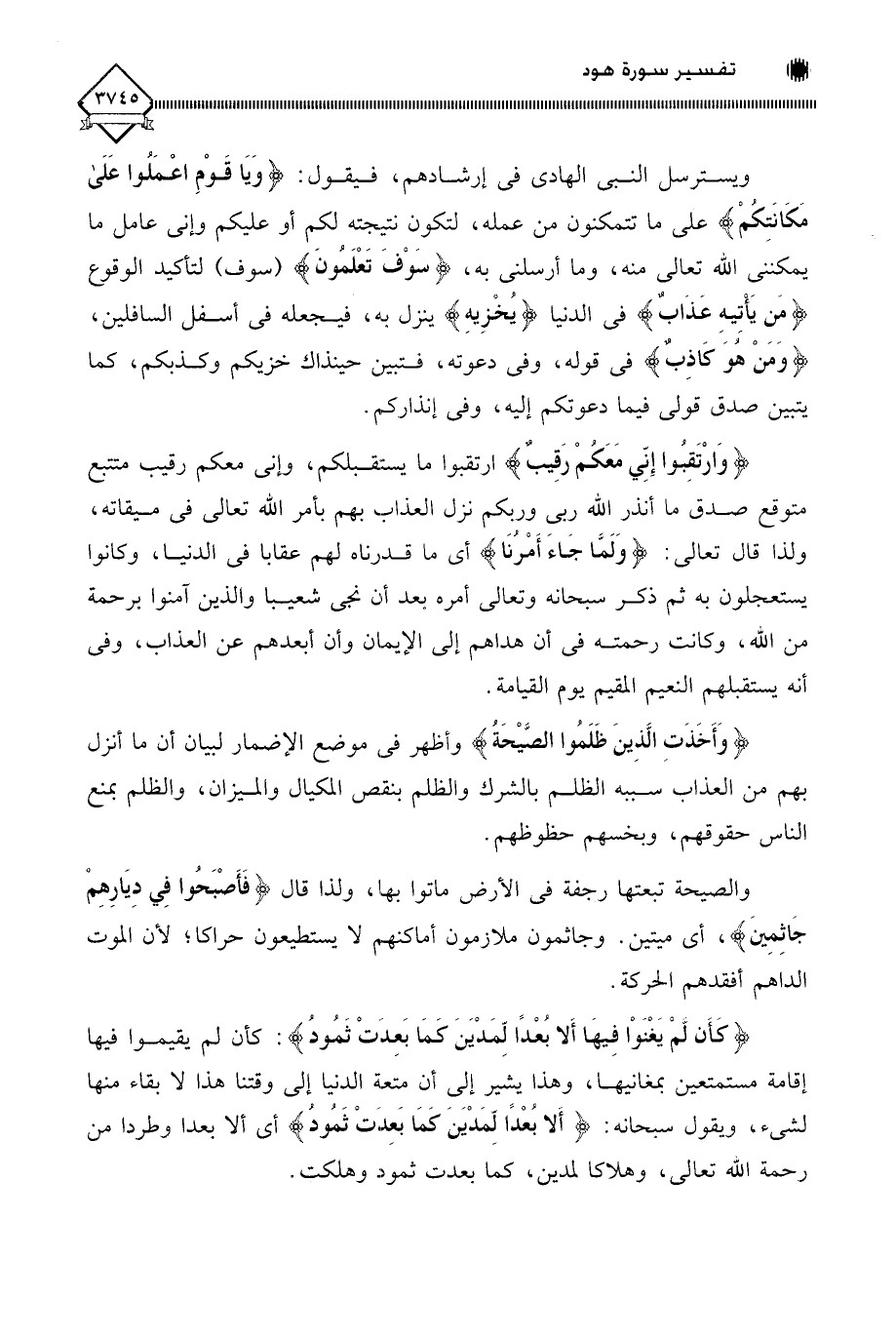 كأن لم يقيموا فيها إقامة مستمتعين بمغانيها، وهذا يشير إلى أن متعة الدنيا إلى وقتنا هذا لَا بقاء منها لشيء، ويقول سيحانه: (أَلَا بُعْدًا لِمَدْيَنَ كَمَا بَعِدَتْ ثَمُودُ) أي ألا بعدا وطردا من رحمة الله تعالى، وهلاكا لمدين، كما بعدت ثمود. وهلكت.