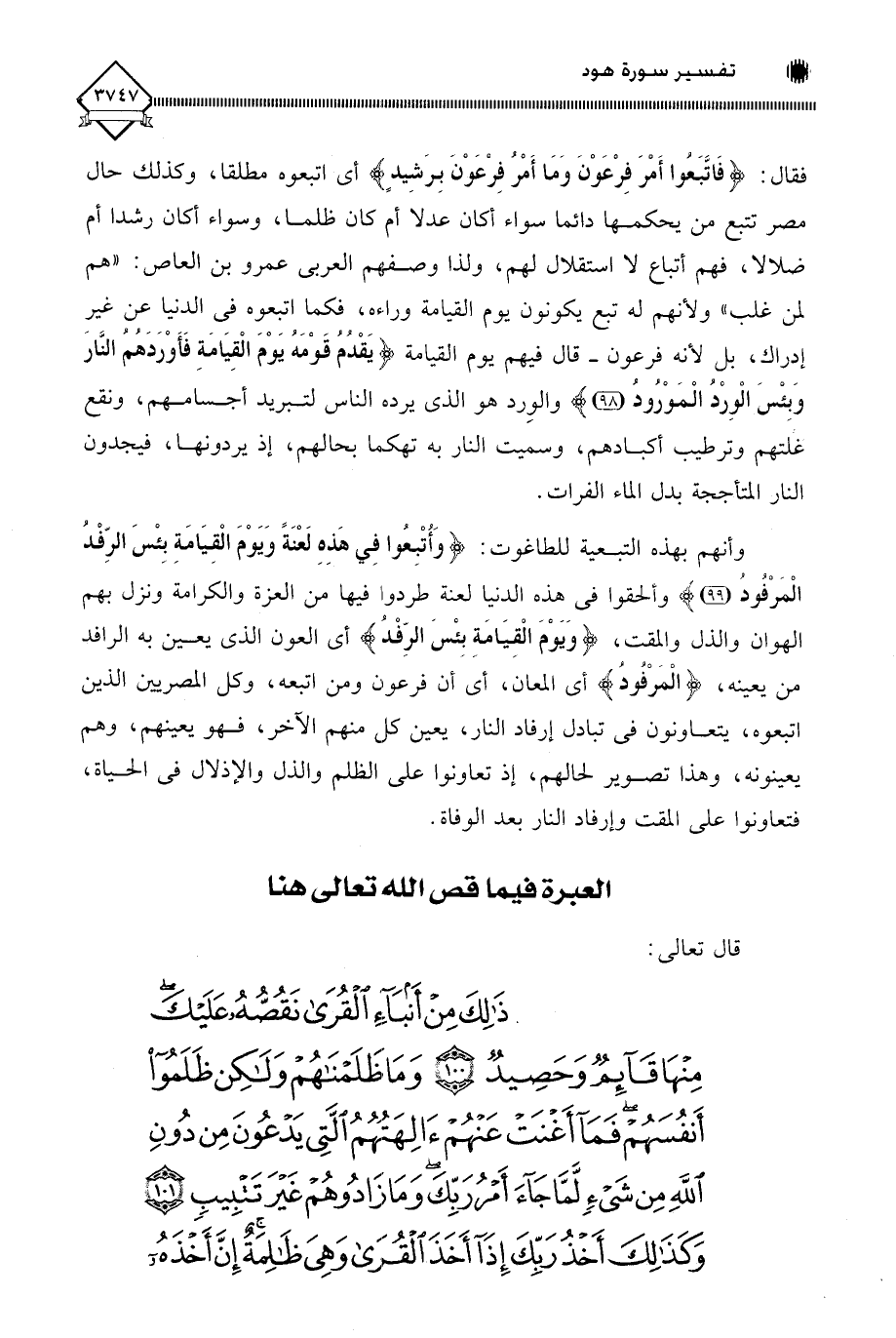 فقال: (فَاتَّبَعُوا أَمْرَ فِرْعَوْنَ وَمَا أَمْرُ فِرْعَوْنَ بِرَشِيدٍ) أي اتبعوه مطلقا، وكذلك حال مصر تتبع من يحكمها دائما سواء أكان عدلا أم كان ظلما، وسواء أكان رشدا أم ضلالا، فهم أتباع لَا استقلال لهم، ولذا وصفهم العربي عمرو بن العاص: " هم لمن غلب " ولأنهم له تبع يكونون يوم القيامة وراءه، فكما اتبعوه في الدنيا عن غير إدراك، بل لأنه فرعون - قال فيهم يوم القيامة
