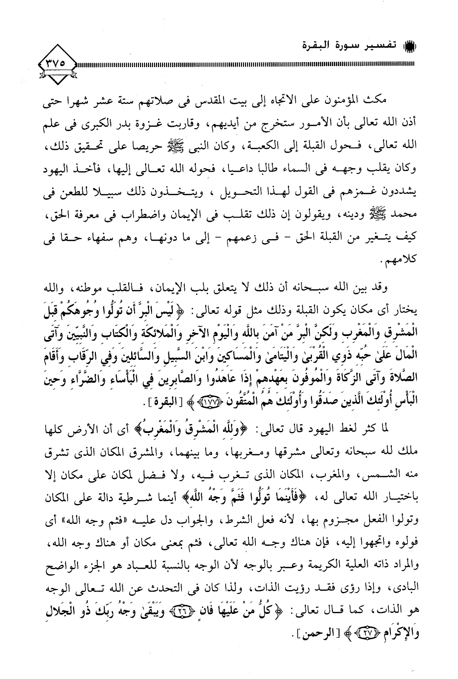 وقد بين الله سبحانه أن ذلك لَا يتعلق بلب الإيمان، فالقلب موطنه، والله يختار أي مكان يكون القبلة وذلك مثل قوله تعالى: (لَيْسَ الْبِرَّ أَنْ تُوَلُّوا وُجُوهَكُمْ قِبَلَ الْمَشْرِقِ وَالْمَغْرِبِ وَلَكِنَّ الْبِرَّ مَنْ آمَنَ بِاللَّهِ وَالْيَوْمِ الْآخِرِ وَالْمَلَائِكَةِ وَالْكِتَابِ وَالنَّبِيِّينَ وَآتَى الْمَالَ عَلَى حُبِّهِ ذَوِي الْقُرْبَى وَالْيَتَامَى وَالْمَسَاكِينَ وَابْنَ السَّبِيلِ وَالسَّائِلِينَ وَفِي الرِّقَابِ وَأَقَامَ الصَّلَاةَ وَآتَى الزَّكَاةَ وَالْمُوفُونَ بِعَهْدِهِمْ إِذَا عَاهَدُوا وَالصَّابِرِينَ فِي الْبَأْسَاءِ وَالضَّرَّاءِ وَحِينَ الْبَأْسِ أُولَئِكَ الَّذِينَ صَدَقُوا وَأُولَئِكَ هُمُ الْمُتَّقُونَ (177).