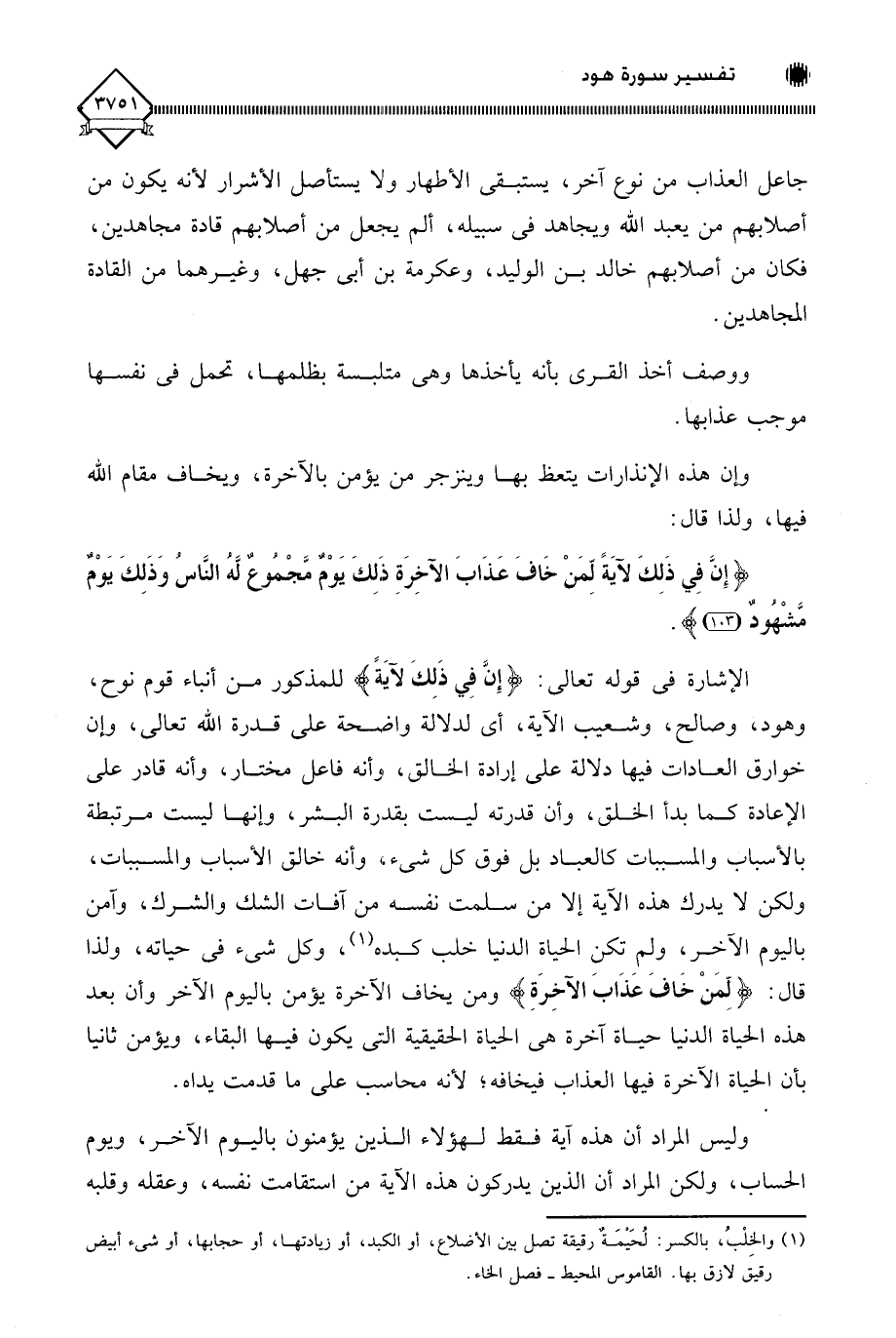 الإشارة في قوله تعالى: (إِنَّ فِي ذَلِكَ لَآيَةً) للمذكور من أنباء قوم نوح، وهود، وصالح، وشعيب الآية، أي لدلالة واضحة على قدرة اللَّه تعالى، وإن خوارق العادات فيها دلالة على إرادة الخالق، وأنه فاعل مختار، وأنه قادر على الإعادة كما بدأ الخلق، وأن قدرته ليست بقدرة البشر، وإنها ليست مرتبطة بالأسباب والمسببات كالعباد بل فوق كل شيء، وأنه خالق الأسباب والمسببات، ولكن لَا يدرك هذه الآية إلا من سلمت نفسه من آفات الشك والشرك، وآمن باليوم الآخر، ولم تكن الحياة الدنيا خلب كبده (¬1)، وكل شيء في حياته، ولذا قال: (لمَنْ خَافَ عَذَابَ الآخِرَةِ) ومن يخاف الآخرة يؤمن باليوم الآخر وأن بعد هذه الحياة الدنيا حياة آخرة هي الحياة الحقيقية التي يكون فيها البقاء، ويؤمن ثانيا بأن الحياة الآخرة فيها العذاب فيخافه، لأنه محاسب على ما قدمت يداه.