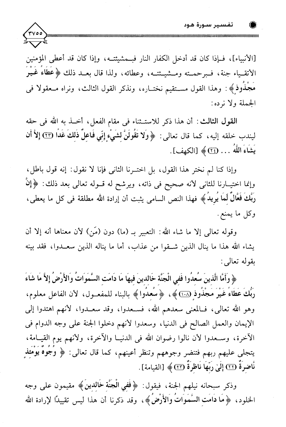 فإذا كان قد أدخل الكفار النار فبمشيئته، وإذا كان قد أعطى المؤمنين الأتقياء جنة، فبرحمته ومشيئته، وعطائه، ولذا قال بعد ذلك (عَطَاءً غَيْرَ مَجْذُوذٍ): وهذا القول مستقيم نختاره، ونذكر القول الثالث، ونراه معقولا في الجملة ولا نرده: