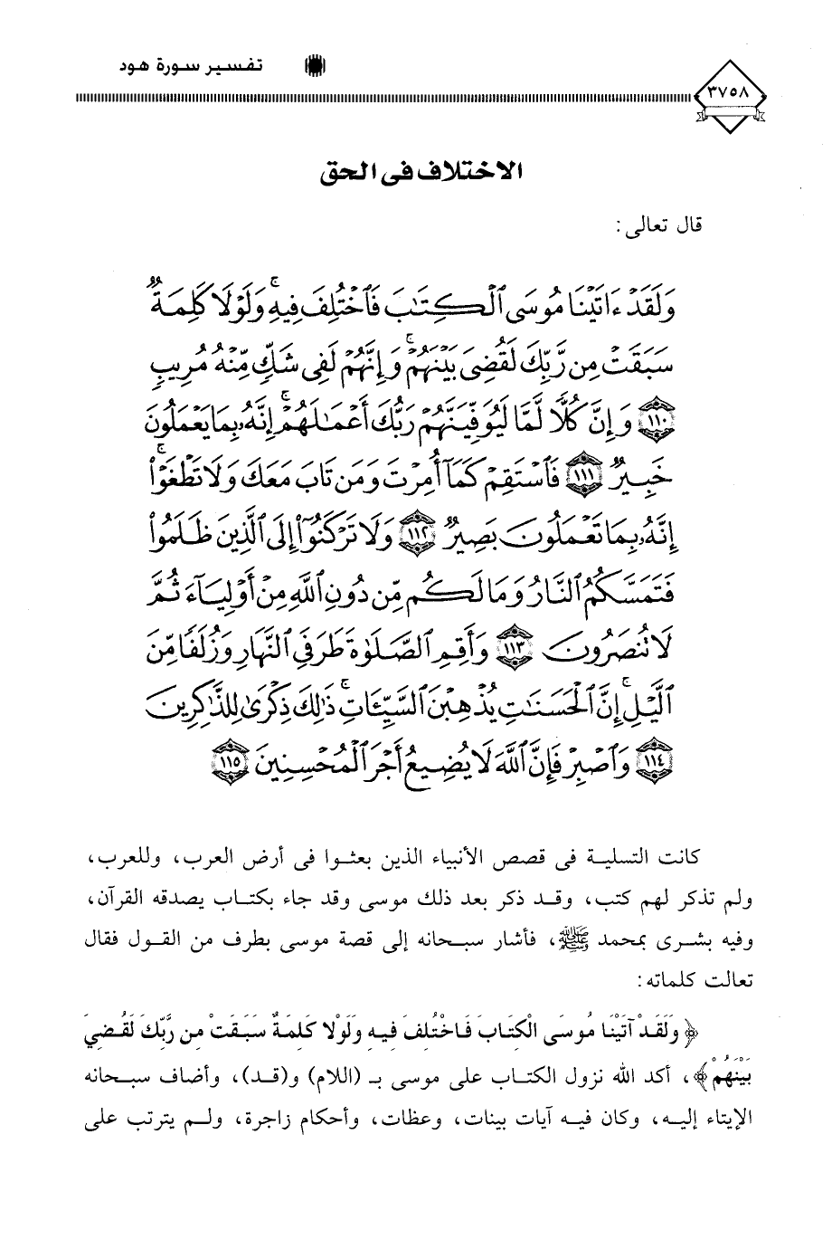 (وَلَقَدْ آتَيْنَا مُوسَى الْكِتَابَ فَاخْتُلِفَ فِيهِ وَلَوْلَا كَلِمَةٌ سَبَقَتْ مِنْ رَبِّكَ لَقُضِيَ بَيْنَهُمْ وَإِنَّهُمْ لَفِي شَكٍّ مِنْهُ مُرِيبٍ (110) وَإِنَّ كُلًّا لَمَّا لَيُوَفِّيَنَّهُمْ رَبُّكَ أَعْمَالَهُمْ إِنَّهُ بِمَا يَعْمَلُونَ خَبِيرٌ (111) فَاسْتَقِمْ كَمَا أُمِرْتَ وَمَنْ تَابَ مَعَكَ وَلَا تَطْغَوْا إِنَّهُ بِمَا تَعْمَلُونَ بَصِيرٌ (112) وَلَا تَرْكَنُوا إِلَى الَّذِينَ ظَلَمُوا فَتَمَسَّكُمُ النَّارُ وَمَا لَكُمْ مِنْ دُونِ اللَّهِ مِنْ أَوْلِيَاءَ ثُمَّ لَا تُنْصَرُونَ (113) وَأَقِمِ الصَّلَاةَ طَرَفَيِ النَّهَارِ وَزُلَفًا مِنَ اللَّيْلِ إِنَّ الْحَسَنَاتِ يُذْهِبْنَ السَّيِّئَاتِ ذَلِكَ ذِكْرَى لِلذَّاكِرِينَ (114) وَاصْبِرْ فَإِنَّ اللَّهَ لَا يُضِيعُ أَجْرَ الْمُحْسِنِينَ (115)