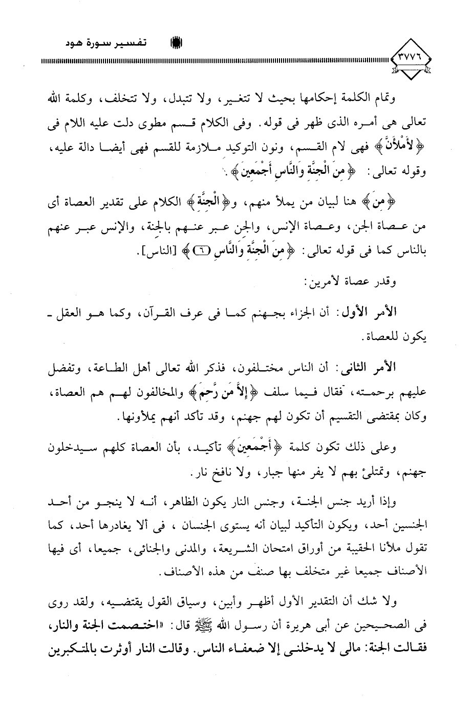ولا شك أن التقدير الأول أظهر وأبين، وسياق القول يقتضيه، ولقد روي في الصحيحين عَنْ أَبِي هُرَيْرَةَ رَضِيَ اللَّهُ عَنْهُ، قَالَ: قَالَ النَّبِيُّ صَلَّى اللهُ عَلَيْهِ وَسَلَّمَ " تَحَاجَّتِ الجَنَّةُ وَالنَّارُ، فَقَالَتِ النَّارُ: أُوثِرْتُ بِالْمُتَكَبِّرِينَ