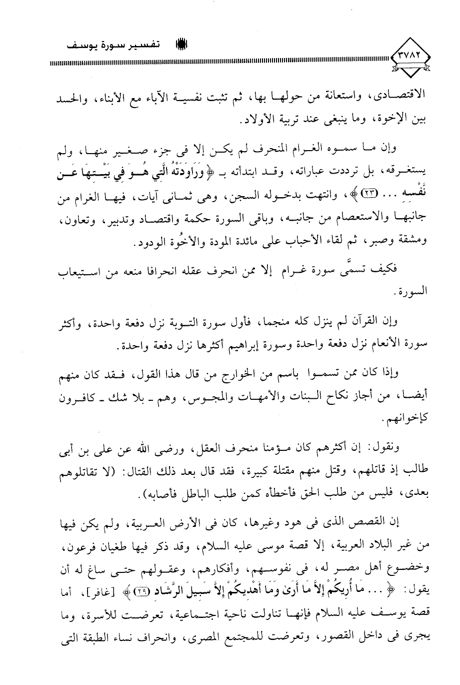 وإن ما سموه الغرام المنحرف لم يكن إلا في جزء صغير منها، ولم يستغرقه، بل ترددت عباراته، وقد ابتدأته بـ (وَرَاوَدَتْهُ الَّتِي هُوَ فِي بَيْتِهَا عَن نَّفْسِهِ. . .)، وانتهت بدخوله السجن، وهي ثماني آيات، فيها الغرام من جانبها والاستعصام من جانبه، وباقي السورة حكمة واقتصاد وتدبير، وتعاون، ومشقة وصبر، ثم لقاء الأحباب على مائدة المودة والأخُوة الودود.