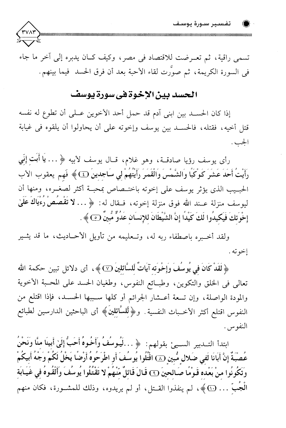 إذا كان الحسد بين ابني آدم قد حمل أحد الأخوين على أن تطوع له نفسه قتل أخيه، فقتله، فالحسد بين يوسف وإخوته على أن يحاولوا أن يلقوه في غيابة الجب.