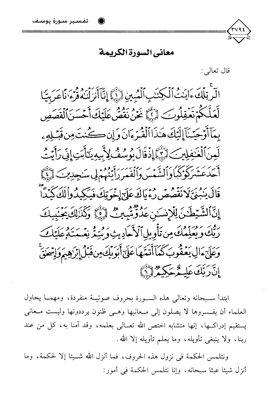 الر تِلْكَ آيَاتُ الْكِتَابِ الْمُبِينِ (1) إِنَّا أَنْزَلْنَاهُ قُرْآنًا عَرَبِيًّا لَعَلَّكُمْ تَعْقِلُونَ (2) نَحْنُ نَقُصُّ عَلَيْكَ أَحْسَنَ الْقَصَصِ بِمَا أَوْحَيْنَا إِلَيْكَ هَذَا الْقُرْآنَ وَإِنْ كُنْتَ مِنْ قَبْلِهِ لَمِنَ الْغَافِلِينَ (3) إِذْ قَالَ يُوسُفُ لِأَبِيهِ يَا أَبَتِ إِنِّي رَأَيْتُ أَحَدَ عَشَرَ كَوْكَبًا وَالشَّمْسَ وَالْقَمَرَ رَأَيْتُهُمْ لِي سَاجِدِينَ (4) قَالَ يَا بُنَيَّ لَا تَقْصُصْ رُؤْيَاكَ عَلَى إِخْوَتِكَ فَيَكِيدُوا لَكَ كَيْدًا إِنَّ الشَّيْطَانَ لِلْإِنْسَانِ عَدُوٌّ مُبِينٌ (5) وَكَذَلِكَ يَجْتَبِيكَ رَبُّكَ وَيُعَلِّمُكَ مِنْ تَأْوِيلِ الْأَحَادِيثِ وَيُتِمُّ نِعْمَتَهُ عَلَيْكَ وَعَلَى آلِ يَعْقُوبَ كَمَا أَتَمَّهَا عَلَى أَبَوَيْكَ مِنْ قَبْلُ إِبْرَاهِيمَ وَإِسْحَاقَ إِنَّ رَبَّكَ عَلِيمٌ حَكِيمٌ (6)