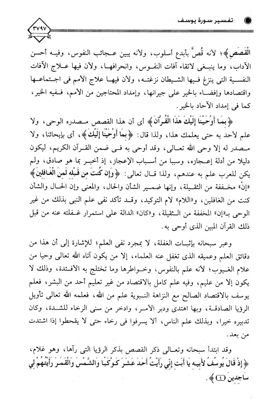 (بِمَا أَوْحَيْنَا إِلَيْكَ هَذَا الْقُرْآنَ) أي أن هذا القصص مصدره الوحي، ولا علم لأحد به حتى يعلمك هذا، ولذا قال: (بِمَا أَوْحَيْنا إِلَيْكَ)، أي بإيحائنا، ولا مصدر له إلا وحي اللَّه تعالى، وقد أوحى به في ضمن القرآن الكريم، ليكون دليلا من أدلة إعجازه، وسببا من أسباب الإعجاز، إذ أخبر بما هو صادق، ولم يكن للعرب علم به عندهم، ولذا قال تعالى: (وَإِن كُنتَ مِن قَبْلِهِ لَمِنَ الْغَافِلِينَ) " إنْ " مخففة من الثقيلة، وإنها ضمير الشأن والحال، والمعنى وإن الحال والشأن كنت من الغافلين، و " اللام " لام التوكيد، وقد تأكد نفي علم النبي بذلك من غير الوحي بـ " إن " المخففة من الثقيلة، و " كان " الدالة على استمرار غفلته عنه من قبل ذلك القرآن المبين الذي أوحى به.