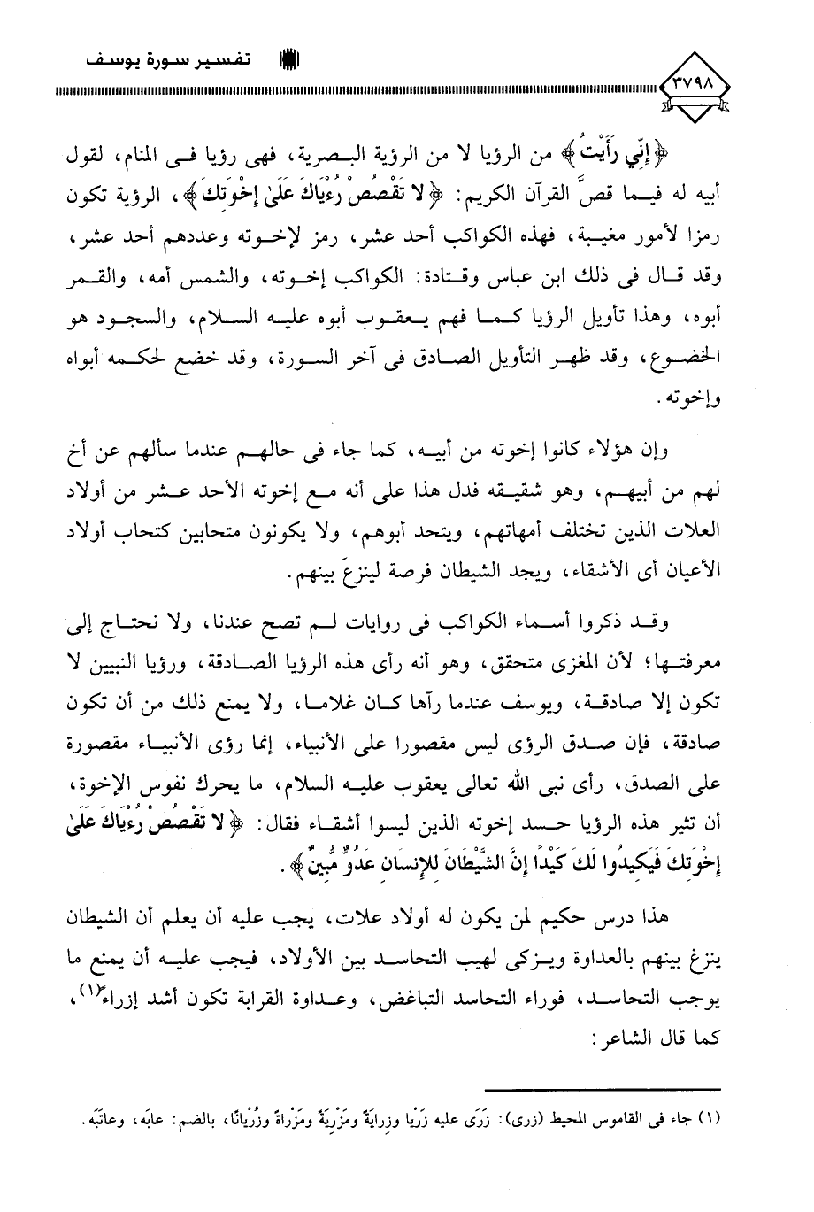 (إنِّي رَأَيْتُ) من الرؤيا لَا من الرؤية البصرية، فهي رؤيا في المنام، لقول أبيه له فيما قصَّ القرآن الكريم: (لا تَقْصُصْ رُءْيَاكَ عَلَى إِخْوَتِكَ)، الرؤية تكون رمزا لأمور مغيبة، فهذه الكواكب أحد عشر، رمز لإخوته وعددهم أحد عشر، وقد قال في ذلك ابن عباس وقتادة: الكواكب إخوته، والشمس أمه، والقمر أبوه، وهذا تأويل الرؤيا كما فهم يعقوب أبوه عليه السلام، والسجود هو الخضوع، وقد ظهر التأويل الصادق في آخر السورة، وقد خضع لحكمه أبواه وإخوته.