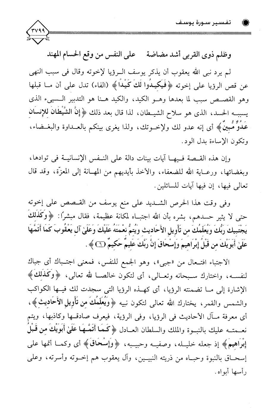 وظلم ذوي القربى أشد مضاضة على النفس من وقع الحسام المهند لم يرد نبي الله يعقوب أن يذكر يوسف الرؤيا لإخوته وقال في سبب النهي عن قص الرؤيا على إخوته (فَيَكِيدُوا لَكَ كيدًا) (الفاء) تدل على أن ما قبلها وهو القصص سبب لما بعدها وهو الكيد، والكيد هنا هو التدبير السيئ الذي يسببه الحسد، الذي هو سلاح الشيطان، لذا قال بعد ذلك (إِنَّ الشَّيطَانَ لِلإِنسَانِ عَدُوٌّ مبِينٌ) أي إنه عدو لك ولإخوتك، ولذا يغري بينكم بالعداوة والبغضاء، وتكون الإساءة بدل الود.