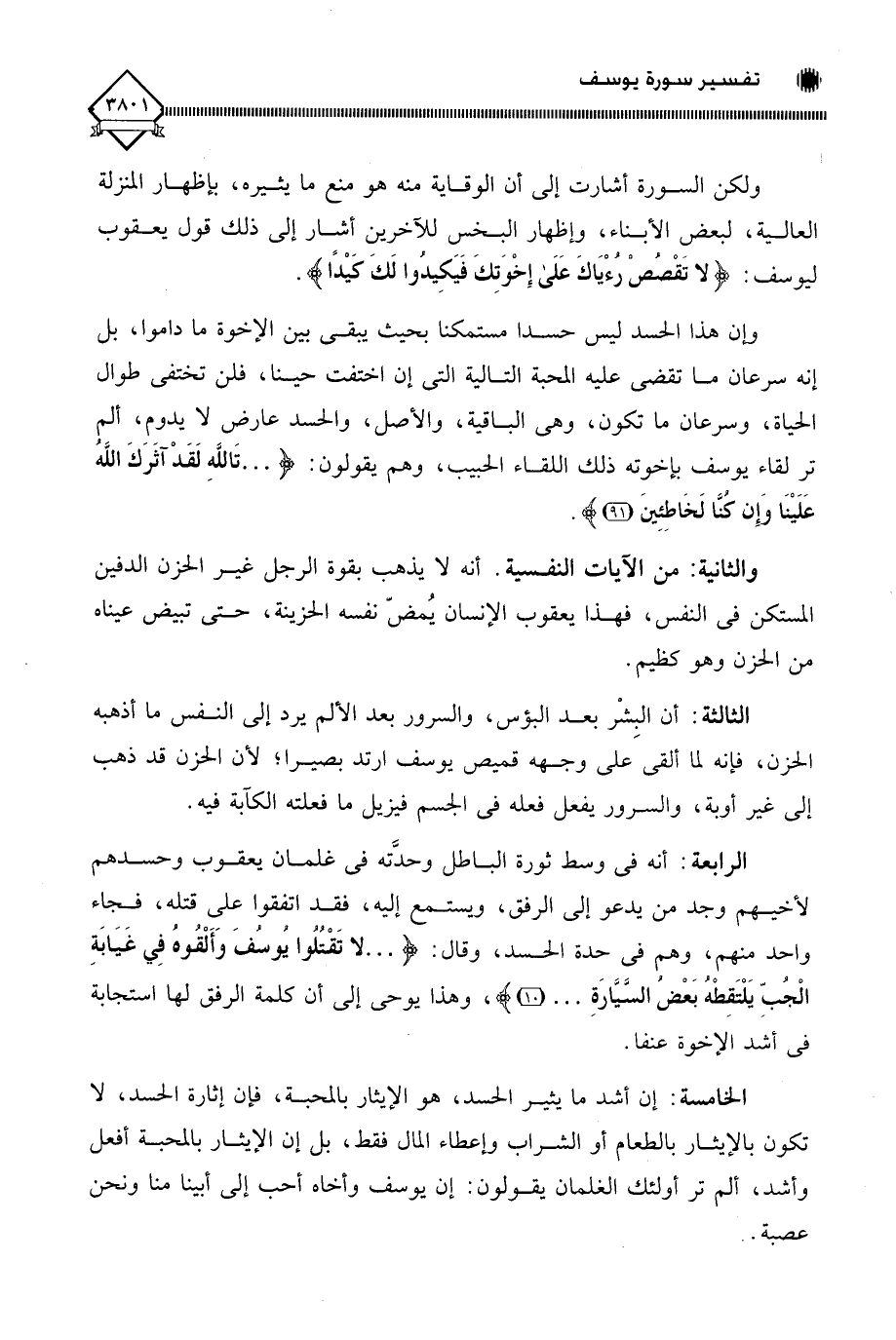ولكن السورة أشارت إلى أن الوقاية منه هو منع ما يثيره، بإظهار المنزلة العالية، لبعض الأبناء، وإظهار البخس للآخرين أشار إلى ذلك قول يعقوب ليوسف: (لا تَقْصُصْ رُءْيَاكَ عَلَى إِخْوَتِكَ فَيَكِيدُوا لَكَ كَيْدًا.) وإن هذا الحسد ليس حسدا مستمكنا بحيث يبقى بين الإخوة ما داموا، بل إنه سرعان ما تقضي عليه المحبة التالية التي إن اختفت حينا، فلن تختفي طوال الحياة، وسرعان ما تكون، وهي الباقية، والأصل، والحسد عارض لَا يدوم، ألم تر لقاء يوسف بإخوته ذلك اللقاء الحبيب، وهم يقولون: (. . . تَاللَّهِ لَقَدْ آثَرَكَ اللَّهُ عَلَيْنَا وَإِنْ كُنَّا لَخَاطِئِينَ (91).