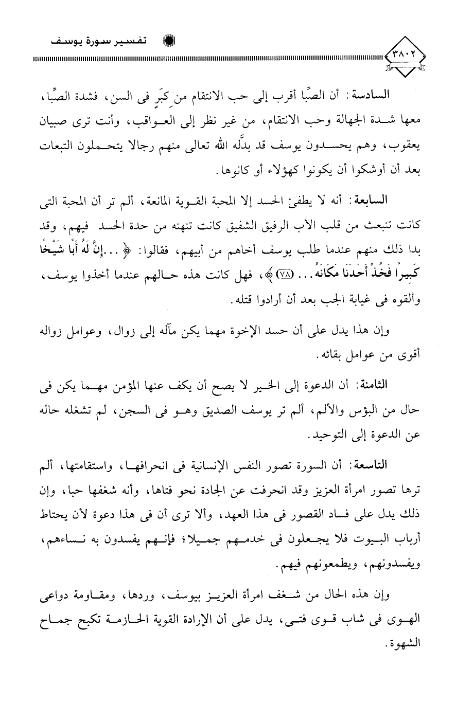التاسعة: أن السورة تصور النفس الإنسانية في انحرافها، واستقامتها، ألم ترها تصور امرأة العزيز وقد انحرفت عن الجادة نحو فتاها، وأنه شغفها حبا، وإن ذلك يدل على فساد القصور في هذا العهد، وألا ترى أن في هذا دعوة لأن يحتاط أرباب البيوت فلا يجعلون في خدمهم جميلا؛ فإنهم يفسدون به نساءهم، ويفسدونهم، ويطمعونهم فيهم.