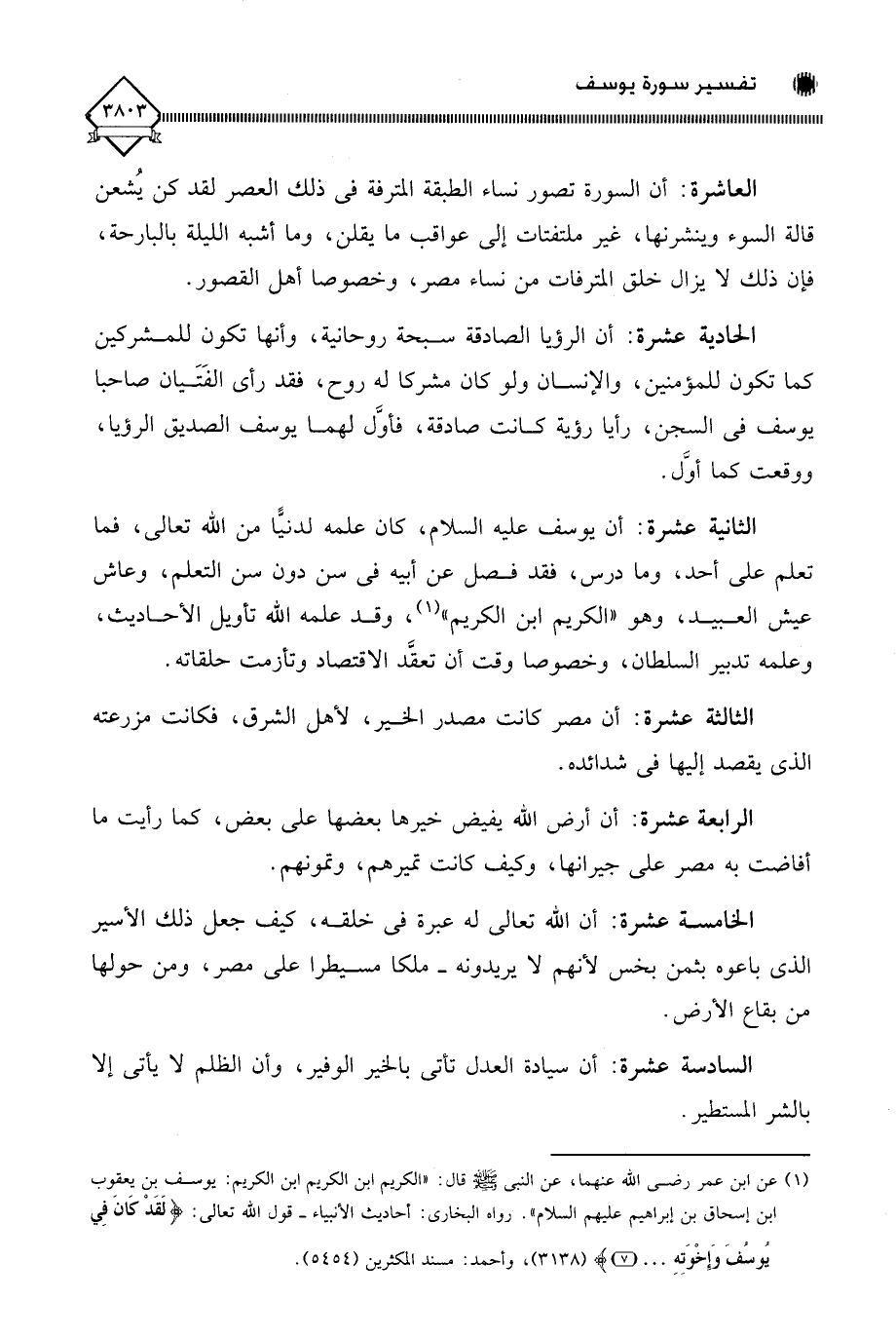 العاشرة: أن السورة تصور نساء الطبقة المترفة في ذلك العصر لقد كن يُشعن قالة السوء وينشرنها، غير ملتفتات إلى عواقب ما يقلن، وما أشبه الليلة بالبارحة، فإن ذلك لَا يزال خلق المترفات من نساء مصر، وخصوصا أهل القصور.