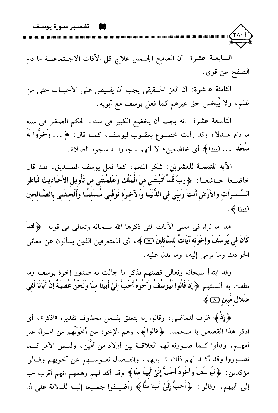 التاسعة عشرة: أنه يجب أن يخضع الكبير في سنه، لحكم الصغير في سنه ما دام عدلا، وقد رأيت خضوع يعقوب ليوسف، كما قال: (. . . وَخَرُّوا لَهُ سُجَّدًا. . .) أي خاضعين؛ لَا أنهم سجدوا له سجود الصلاة.