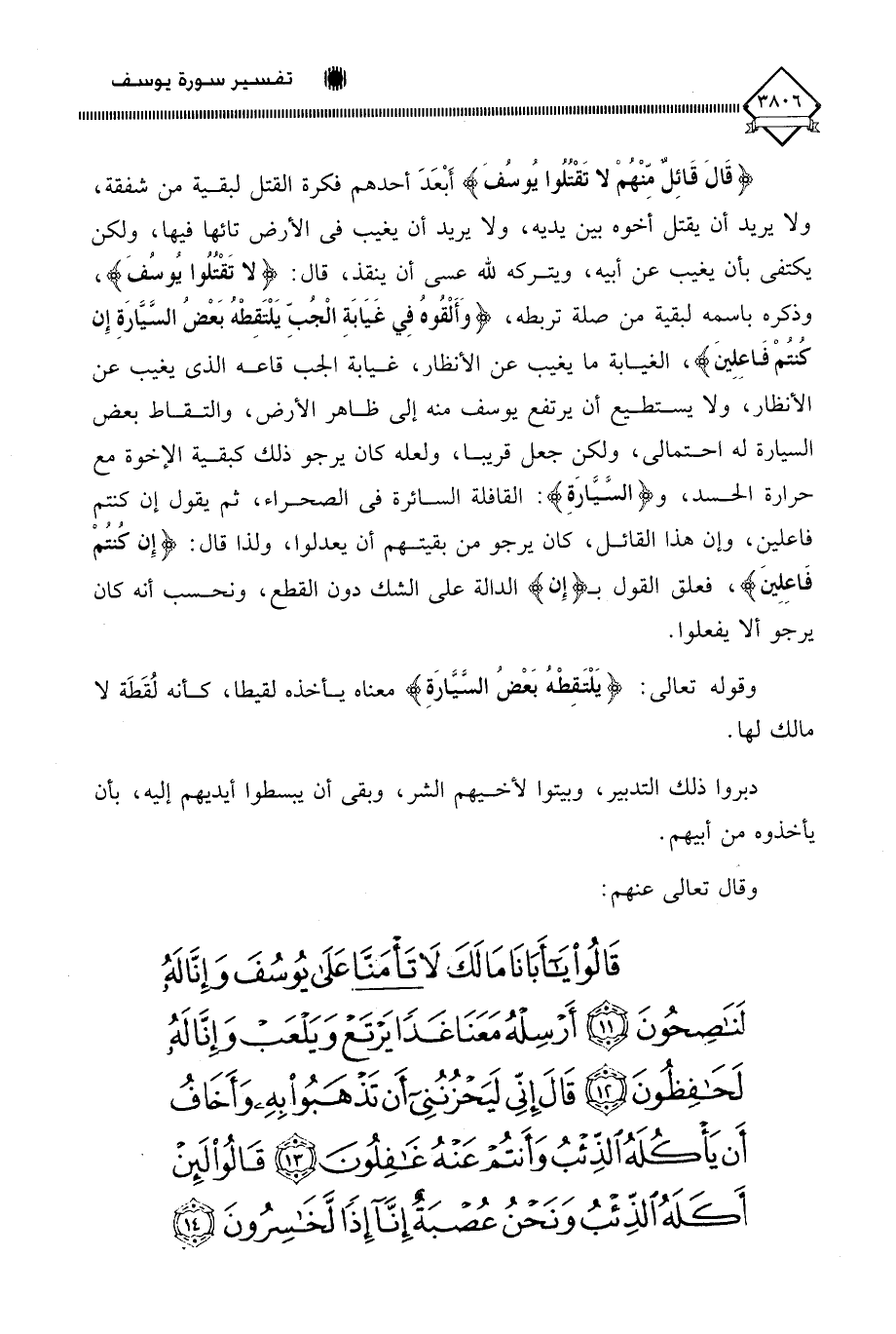 (قَالُوا يَا أَبَانَا مَا لَكَ لَا تَأْمَنَّا عَلَى يُوسُفَ وَإِنَّا لَهُ لَنَاصِحُونَ (11) أَرْسِلْهُ مَعَنَا غَدًا يَرْتَعْ وَيَلْعَبْ وَإِنَّا لَهُ لَحَافِظُونَ (12) قَالَ إِنِّي لَيَحْزُنُنِي أَنْ تَذْهَبُوا بِهِ وَأَخَافُ أَنْ يَأْكُلَهُ الذِّئْبُ وَأَنْتُمْ عَنْهُ غَافِلُونَ (13) قَالُوا لَئِنْ أَكَلَهُ الذِّئْبُ وَنَحْنُ عُصْبَةٌ إِنَّا إِذًا لَخَاسِرُونَ (14)